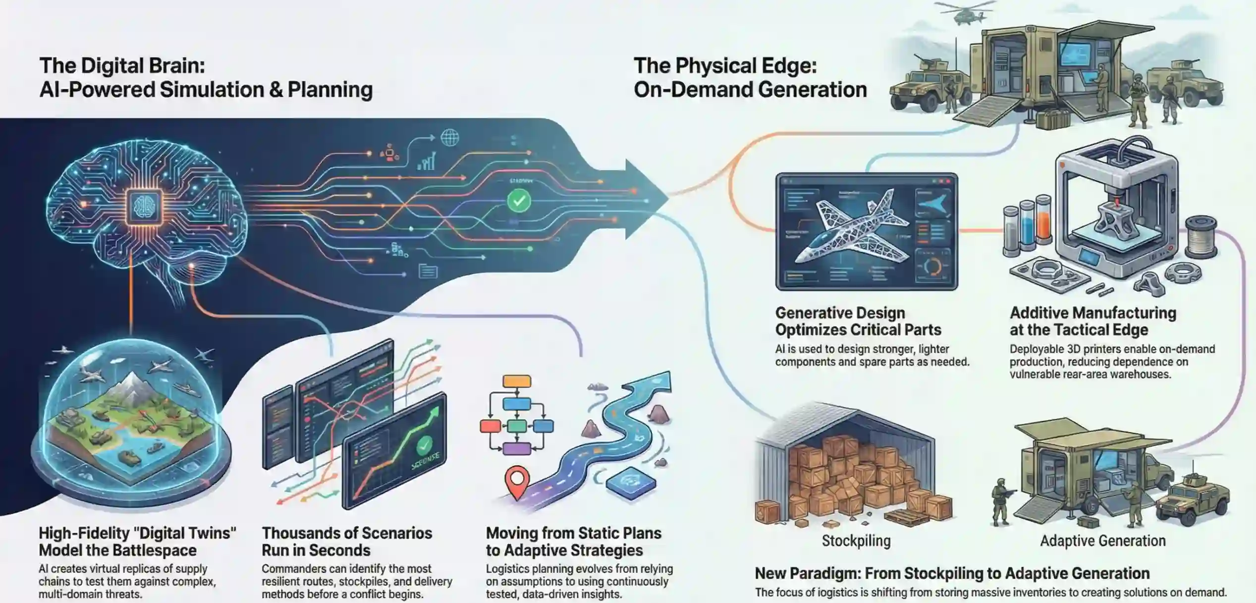 在这些环境中,人工智能系统可以检查计划在面对实际约束和干扰时的表现。后勤网络孪生可以显示补给路线如何应对封锁。基地基础设施孪生可以揭示跑道损坏如何影响架次生成。部队态势孪生可以展示延迟如何在相互依赖的部队中传播。通过运行这些模拟,指挥团队可以在投入部队之前识别瓶颈、测试分支方案和后续行动,并观察二阶效应。