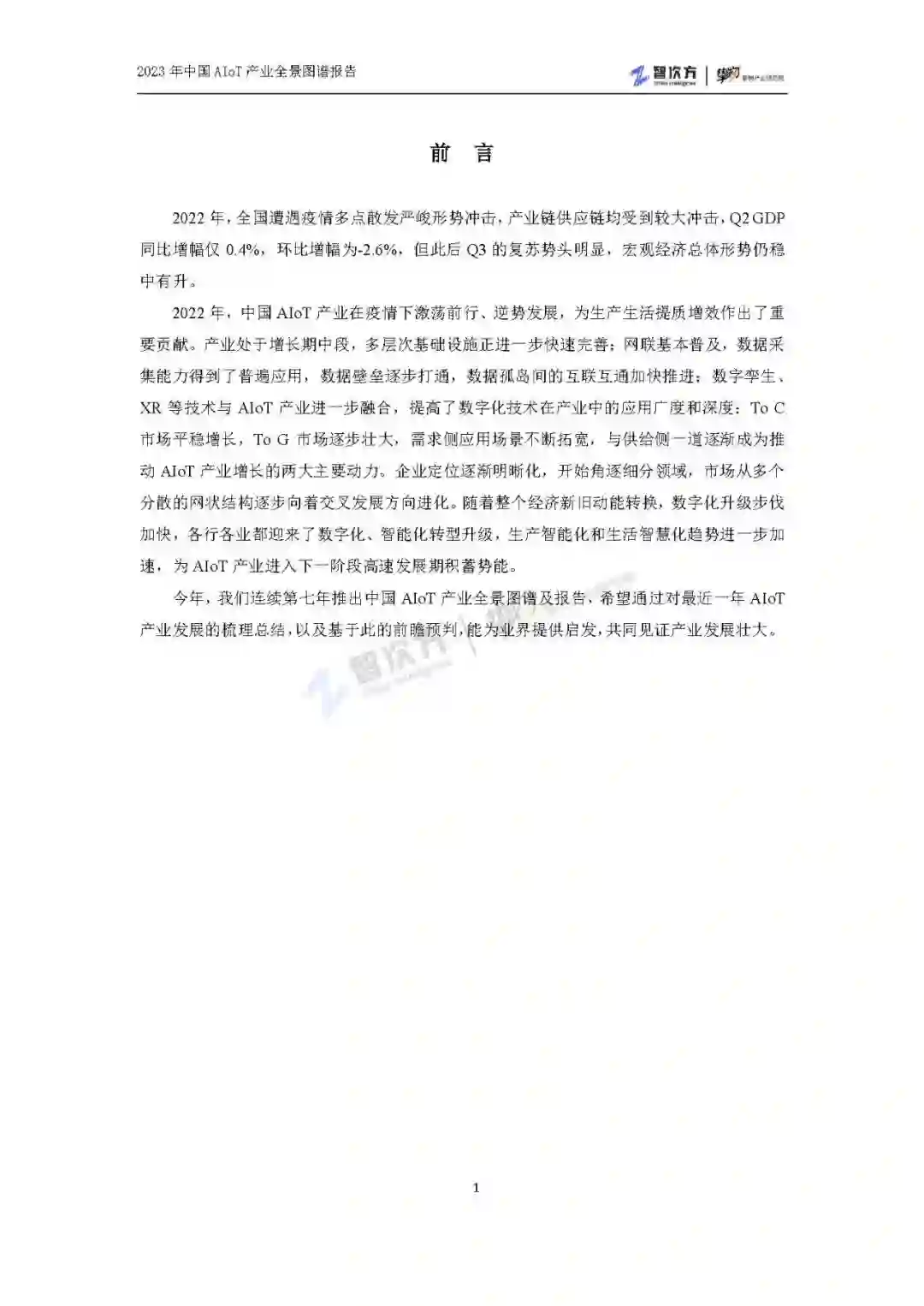 2022 年,中国 AIoT 产业在疫情下激荡前行、逆势发展,为生产生活提质增效作出了重要贡献。产业处于增长期中段,多层次基础设施正进一步快速完善;**网联基本普及,数据采集能力得到了普遍应用,数据壁垒逐步打通,数据孤岛间的互联互通加快推进;数字孪生、 XR 等技术与 AIoT产业进一步融合,提高了数字化技术在产业中的应用广度和深度;To C 市场平稳增长,To G市场逐步壮大,需求侧应用场景不断拓宽,与供给侧一道逐渐成为推动 AIoT产业增长的两大主要动力。**企业定位逐渐明晰化,开始角逐细分领域,市场从多个 分散的网状结构逐步向着交叉发展方向进化。随着整个经济新旧动能转换,数字化升级步伐加快,各行各业都迎来了数字化、智能化转型升级,生产智能化和生活智慧化趋势进一步加 速,为 AIoT产业进入下一阶段高速发展期积蓄势能。