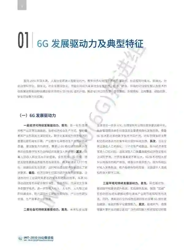 **1. 从6G发展驱动力看,**面向2030年及未来,人类社会将进入智能化时代,数字世界与物理世界将无缝融合,社会服务均衡化、高端化,社会治理科学化、精准化,社会发展绿色化、节能化将成为未来社会发展趋势。经济、社会、环境的可持续发展以及技术的创新演进将驱动移动通信技术持续从5G向6G迭代升级,推进6G向泛在互联、普惠智能、超强感知、全域覆盖、绿色低碳、安全可信等方向拓展。