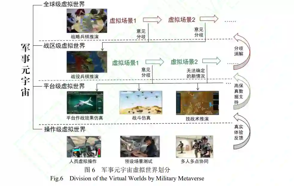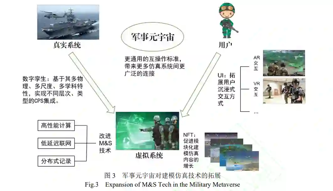 元宇宙是 2021 年以来在商业界和学术界大火的用于描述虚实融合与互动的概念。为研究这 一概念可能的军事应用,梳理了元宇宙的定义、特征及发展脉络,从军事元宇宙对建模仿真技术和 传统实况-虚拟-构造仿真(LVC)拓展的角度分析了构建军事元宇宙的必要性,从训练、作战、数 据信息资源管理的现实需求角度研究了军事元宇宙可能带来的改进,分析了目前宣称正在开发的军 事元宇宙雏形产品及其典型开发方式。元宇宙(Metaverse)是一种描述虚实互动一 体化的概念。2021 年被称作“元宇宙元年”(Year One of Metaverse),国际顶尖的互联网企业,如苹 果、微软、脸书、腾讯、网易等,均开始重视并纷 纷布局元宇宙赛道。脸书态度尤为积极,将公司名 称直接修改为 Meta Platforms[1],显示了其进军元 宇宙的强烈姿态。近两年来,对元宇宙概念、发展与应用的研究 也逐渐成为学术研究中的一个热点。一些典型的综 合类研究包括:Ball[2]对元宇宙的战略、技术和哲 学基础进行了详细描述,将其描绘为“下一代互联 网”;清华大学新媒沈阳团队在 2021—2022 年先后 发布了三篇关于元宇宙发展的研究报告,分别对元 宇宙进行了概念梳理、行业分析、发展预测[3],结 合中国本土文化描述了元宇宙的属性、拓展及其应 用场景、风险治理[4],研究了元宇宙与其他学科的 结合、元宇宙产业及中国式元宇宙等内容[5];赵星 等[6]从理论概念、关键技术、应用场景和政策治理 四方面,对元宇宙研究与应用的现状和未来进行了 综述;等。 一些研究则专注于垂直分类的元宇宙研究,希 望拓展新的研究内容和研究思路,如教育元宇宙[7, 8]、建筑元宇宙[9]、图书档案元宇宙[10, 11]等。作为 扩展现实(XR)、数字孪生、人工智能、3D 互联 网、5G 等多种技术综合涌现的新概念,元宇宙天 然具有一定的技术引领性。随着元宇宙研究成为热 点,其可能具有的军事意义和军事运用潜能也得到 了关注。发展军事元宇宙概念,将战场空间拓展到 元宇宙,可能成为未来军事竞争新的角力点[12, 13]; 军事元宇宙的全新思维方式可以丰富和促进认知 域作战的理论[14],其底层技术可以促进军事建模仿 真领域的新发展[15]。 本文围绕元宇宙及其军事运用,主要开展了以 下工作:1)描述了元宇宙的已有定义和特征,按 照文学影视、游戏娱乐和概念投入三条脉络整理了 元宇宙的概念发展;2)分析了军事元宇宙构建的 必要性,研究了其对于建模仿真技术的拓展及其对 传统 LVC 仿真的拓展;3)从需求角度出发,论述 了军事元宇宙对训练、作战、数据信息资源管理现 实需求的解决方法;4)整理了目前已有的军事元 宇宙雏形产品,重点分析了产品开发中多点同步扩 展现实这一典型开发路径。