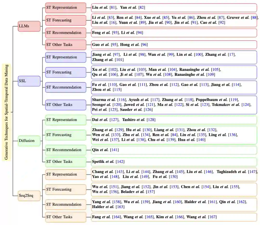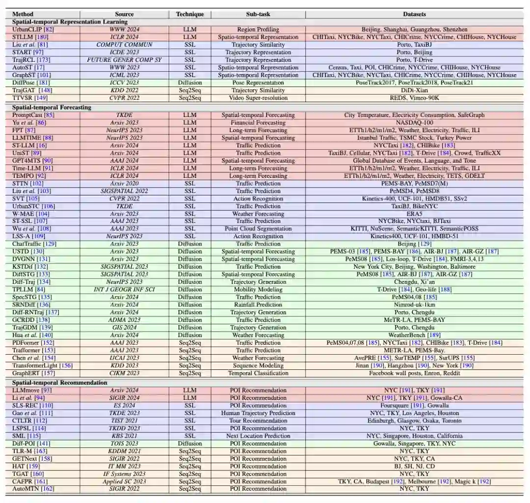 基于生成技术的现有研究分类,由四种技术组成,包括大规模语言模型(LLMs)、自监督学习(SSL)、扩散模型(Diffusion)和序列到序列(Seq2Seq)模型。这些技术涵盖四种时空任务,每种任务都有基于特定生成技术的具体研究。 在不同应用任务中的相关工作,包括时空表示学习、时空预测和时空推荐。我们提供了详细信息,包括期刊/会议名称、使用的具体生成技术、涉及的特定应用子任务以及用于评估的数据集。