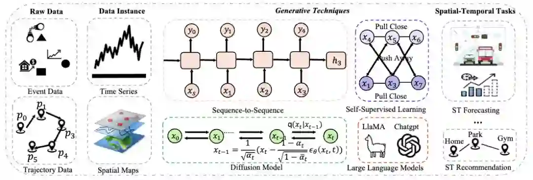 本文聚焦于将生成技术整合到时空数据挖掘中,考虑到时空数据的显著增长和多样性。随着RNN、CNN和其他非生成技术的进步,研究人员已经探索了它们在捕捉时空数据中的时间和空间依赖关系方面的应用。然而,生成技术如大规模语言模型(LLMs)、扩散模型(Diffusion)、自监督学习(SSL)、序列到序列(Seq2Seq)模型和扩散模型的出现,为进一步增强时空数据挖掘开辟了新的可能性。本文对基于生成技术的时空方法进行了全面分析,并引入了一个专门为时空数据挖掘流程设计的标准框架。通过提供详尽的综述和利用生成技术的时空方法的新分类,本文加深了对这一领域中各种技术的理解。此外,本文还强调了未来有前景的研究方向,敦促研究人员深入探索时空数据挖掘。本文强调需要探索尚未开发的机会,推动知识的边界,以解锁新的洞见并提高时空数据挖掘的效果和效率。通过整合生成技术并提供一个标准化的框架,推动了该领域的进步,鼓励研究人员探索生成技术在时空数据挖掘中的巨大潜力。 **