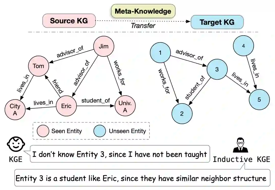 然而传统的KGE方法只能对训练阶段已经见过的实体进行预测和应用(即transductive,直推式场景),因为传统的KGE方法是对一个固定集合的实体学习嵌入表示。所以对知识图谱表示学习来说,可归纳式(inductive)场景更具有挑战,即在测试阶段中会出现训练阶段未见过(unseen)的新实体。如图1所示,在Source KG上训练好的KGE模型无法直接用于Target KG,因为Target KG中的实体在Source KG中没有出现过。