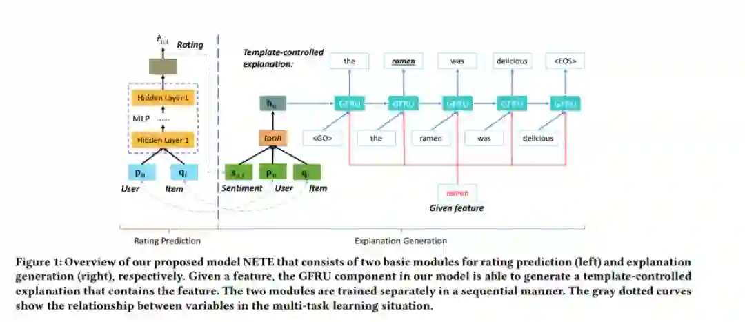 在信息过载的时代,个性化推荐系统对于辅助用户决策具有重要意义。同时,对推荐的解释进一步帮助用户更好地了解被推荐的项目,从而做出知情的选择,这就使得可解释的推荐研究变得非常重要。基于文本句子的解释由于能够向用户传递丰富的信息而成为推荐系统的一种重要的解释形式。然而,现有的句子解释生成方法要么局限于预定义的句子模板,这限制了句子的表现力,要么选择自由风格的句子生成,这使得句子质量难以控制。为了同时提高句子表达能力和质量,我们提出了一种神经模板解释生成框架,它通过从数据中学习句子模板,并生成评论特定特性的模板控制的句子,从而实现了两方面的优点。在真实数据集上的实验结果表明,NETE在句子质量和表达能力方面始终优于最新的解释生成方法。通过对案例研究的进一步分析,也可以看出NETE在产生多样化和可控解释方面的优势。