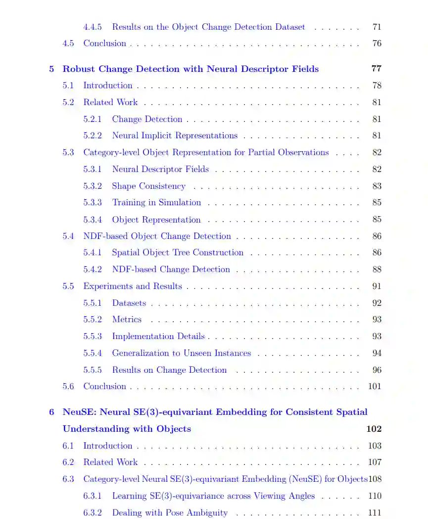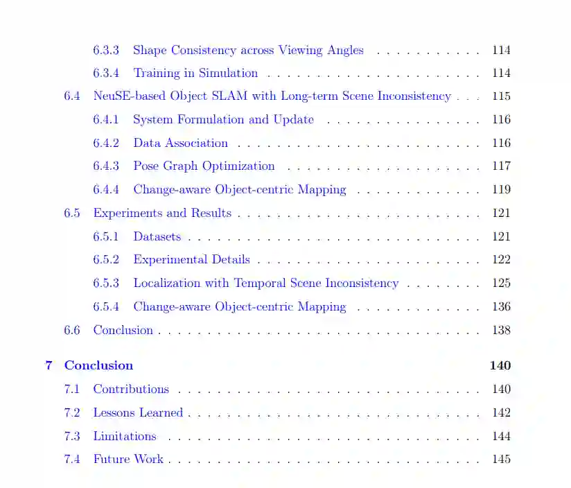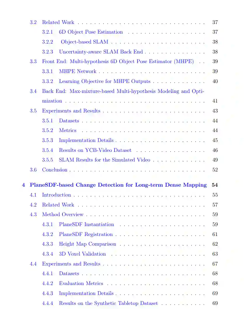 同时定位与地图构建(SLAM)对于自主代理理解其周围环境至关重要。此外,对于高级机器人任务,进行一致的对象级推理至关重要,尤其是涉及在相同环境中重复遍历的活动,例如家庭清洁和物体检索。在不断变化的世界中,机器人应始终定位自己及其目标,同时维护一个更新的环境地图。传统的SLAM依赖于来自观察的静态几何原语,缺乏语义理解。这些无序的点、线或平面集合在对象级解释方面存在困难,导致对场景变化的错误估计。 由于世界的功能和演变以对象为最小单位,辅助对象的SLAM成为一个逻辑选项。本论文围绕在低动态环境中的长期基于对象的SLAM,以弥合SLAM技术与高级机器人应用之间的沟通鸿沟,并提高SLAM与对象级感知的兼容性。它提出了三个贡献: 首先,我们提出了一种多假设方法,用于在基于对象的SLAM中意识到模糊性的对象姿态采用。这种方法适应了由遮挡或对称对象形状引起的固有模糊性。我们以混合专家方式设计了一个多假设对象姿态估计器前端,并利用基于最大混合的后端从一系列姿态假设集中推断出全局一致的相机和对象姿态。 其次,我们为离线和在线应用开发了两种变化检测方法,分别采用了两种新颖的场景和对象表示,即PlaneSDF和形状一致的神经描述符场。关于长期操作,我们考虑了长时间内不可避免的场景变化以及所选地图表示的效率和可扩展性。此外,我们探索了基于集群和对象级别的变化检测,遵循“分而治之”的策略,通过局部场景差异化使变化检测更加准确和灵活。 最后,我们提出了一种用于长期一致空间理解的神经SE(3)-等变对象嵌入(NeuSE)在基于对象的SLAM中。NeuSE被训练用作完整对象模型的紧凑点云替代品。我们基于NeuSE的对象SLAM范式直接衍生了与通用SLAM姿态图优化兼容的SE(3)相机姿态约束。这实现了辅助定位和轻量级以对象为中心的地图,具有变化感知的映射能力,最终实现了尽管时间环境变化仍然健壮的场景理解。