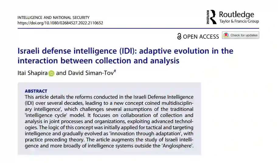 本文详细介绍了以色列国防情报局(IDI)几十年来进行的改革,形成了一个新的概念,即 "多学科情报",它挑战了传统 "情报周期 "模式的几个假设。它的重点是在联合进程和组织中合作收集和分析,利用先进技术。这一概念的逻辑最初被应用于战术和目标情报,并逐渐演变为 "通过适应进行创新",实践先于理论。这篇文章增加了对以色列情报的研究,以及更广泛的对 ""英伦圈"以外的情报系统的研究。