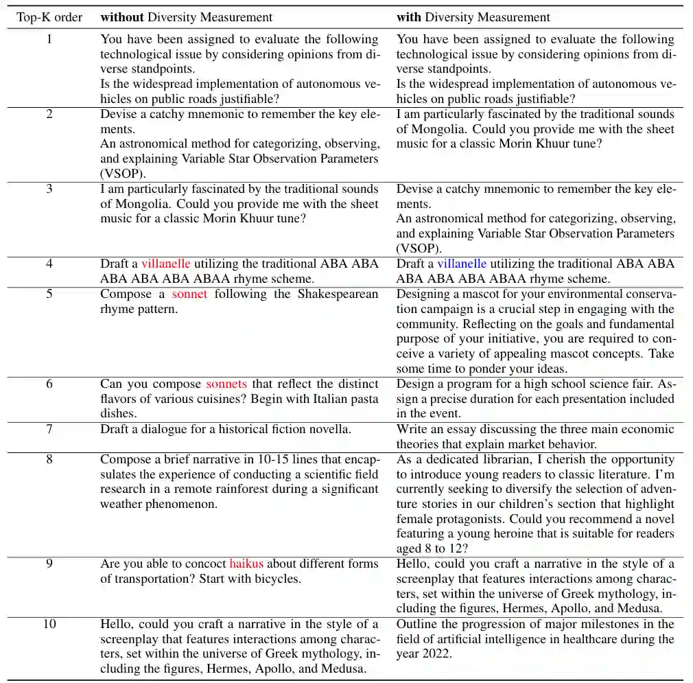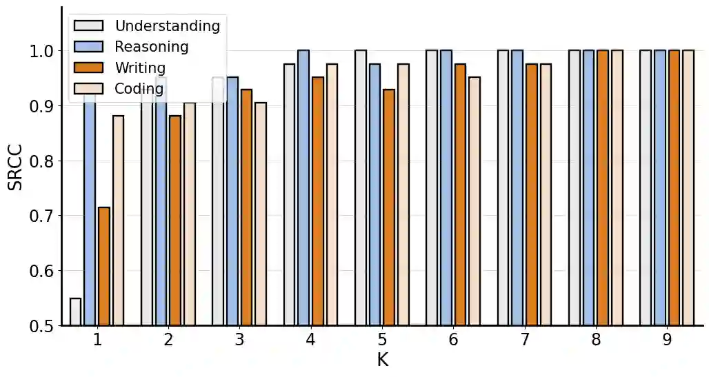 **采样指令数量的稳健性。**我们研究排名结果对人工判断的采样指令数量的稳健性。图2显示了默认top-10排名与其他top-排名之间的斯皮尔曼秩相关系数(SRCC)。所有场景的排名结果都表现出高度稳定性(时SRCC>0.95,时SRCC=1),证明了该方法的样本效率。虽然较大的值提高可靠性,但也增加成本。为平衡可靠性和效率,我们将默认设为10。值得一提的是,值可以灵活调整,并可能因竞争的LLM对而异。如果两个LLM性能相近,我们可以增加进行更多比较;如果性能差异显著,我们可以减少(甚至设为零)以最小化人力成本。这类似于Chatbot Arena中两个LLM之间的对战次数不固定。 **指令多样性度量的重要性。**我们还探讨了方程2中指令多样性度量的重要性()。下表展示了考虑多样性前后,MAD竞争在写作场景中选择的前10条指令。不考虑多样性时,四条指令与诗歌相关,导致场景和任务选择相对同质。考虑多样性后,每条指令几乎代表独特的任务和场景。我们认为场景多样性有利于探索更多类型的模型失败,从而提供更具指导意义的评估见解。