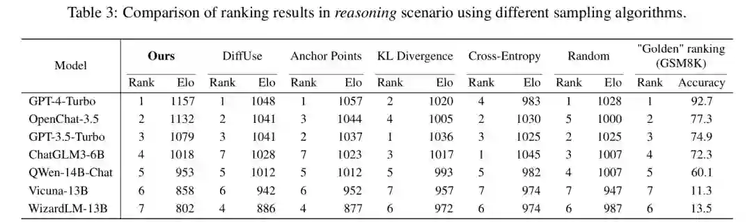 我们将MAD竞争采样算法与五种基线进行比较:1) DiffUse采样框架,2) Anchor Points方法,3) KL散度,4) 基于交叉熵的采样算法,以及5) 随机采样。结果如表3所示。 由于KL散度和交叉熵依赖于令牌对数概率,它们不适用于某些基于API的模型(如Gemini-Pro)。因此,我们在推理场景中评估了七个兼容所有采样方法的LLM。我们的指令池源自GSM8K数据集,指导人类标注者将推理准确性作为关键评估标准。GSM8K测试集上的模型准确率作为"黄金"排名。 值得注意的是,MAD竞争策略仅使用K=10个选定样本就能近似黄金排名,相比原始测试集的8K样本。而其他基线策略的排名显示不一致性。例如,KL散度将GPT-4-Turbo排在前列之后,而交叉熵将ChatGLM3-6B排在GPT-4-Turbo和GPT-3.5-Turbo之前。 我们还定性分析了四种策略在指令选择上的差异。结果表明,KL散度策略选择的指令几乎都与诗歌相关(10个中有9个),交叉熵策略偏好写论文和故事等任务,随机策略经常引入重叠的任务类型。而MAD竞争策略优先考虑指令多样性,最大限度减少所选指令中重复任务类型的出现,有助于在更广泛的任务中暴露LLM的缺陷。