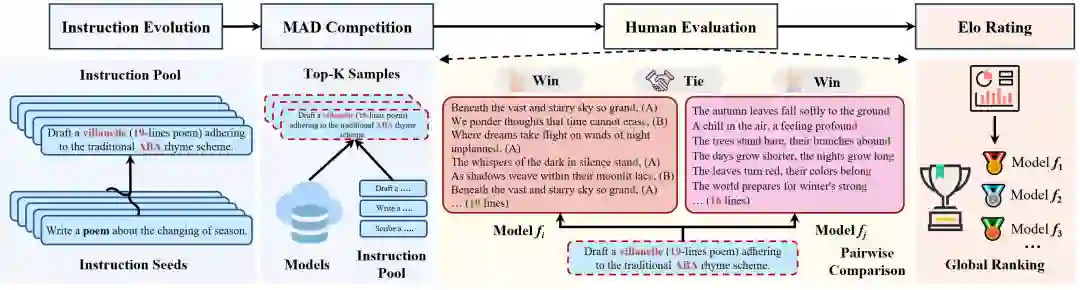 本论文提出了一种样本高效的人工评估方法,通过最大差异竞争方法对大型语言模型(LLM)进行排名。我们强调,我们的方法不是手动策划带有人工标注的固定测试集,而是自动采样一小组信息丰富的指令来区分LLM的性能,从而显著减少人力劳动。此外,通过MAD竞争收集的反例数据不仅是评估前沿LLM的手段,还有助于训练更加健壮的模型(例如对抗训练)。同时,所提出的方法可以扩展到多模态LLM,其输入包括图像、音频和视频等多种类型的数据。在这种扩展中,我们需要在构建指令池时考虑其他模态,而不需要对其他程序进行重大修改。未来,我们将增加LLM的数量并通过纳入更多场景扩大评估范围,最终创建一个向公众开放的综合排行榜。