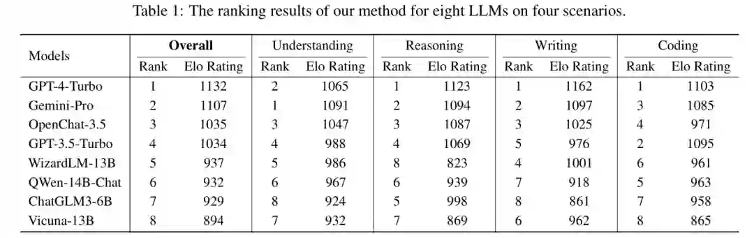 指令池构建:构建了跨多场景的大规模指令集,通过:(1) 确定评估场景,(2) 收集基准数据集中的指令种子,(3) 使用指令演化方法生成模拟真实人机交互的指令。评估四个能力层次:科学知识理解、数学推理、创意写作和代码生成。每个场景采样3K指令种子,经10次演化,最终获得每场景30K指令。 用于排名的LLM选择:选择了8个广泛认可的LLM,包括3个专有模型(GPT-3.5-Turbo、GPT-4-Turbo、Gemini-Pro)和5个开源模型(WizardLM-13B、Vicuna-13B、OpenChat-3.5、Qwen-14B-Chat、ChatGLM3-6B)。 相似度度量选择:采用计算嵌入向量余弦相似度的方法,使用OpenAI的text-embedding-ada-002模型。 人类偏好收集:使用三选一强制选择方法(即胜、负、平),参与者选择质量更优的回应。我们为每对比较的LLM选择10个差异最大化指令,总共280次()次比较,由13名STEM背景研究生评估。