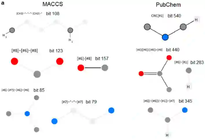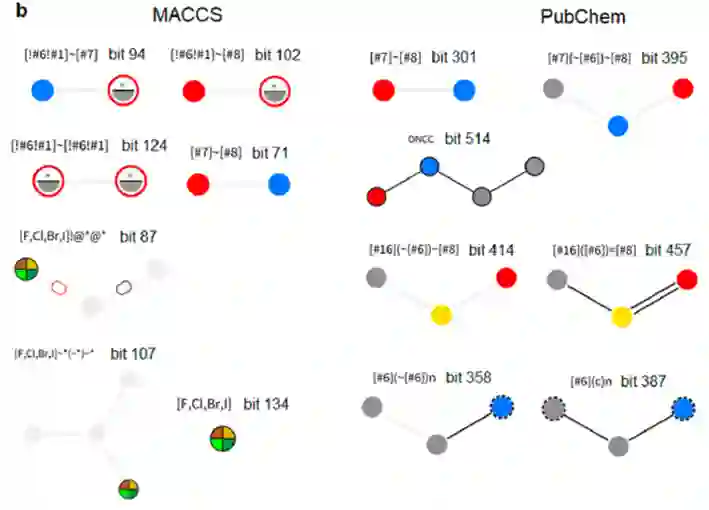 图-2, 累加式分子指纹算法记录的ACE靶点高频活性/无活性子结构信息。a)左为利用MACCS表征化合物时算法统计的高频活性子结构,右为PubChem结果;b)无活性分子高频子结构信息。虚线圆圈表示芳环,不同颜色表示不同元素,红圈表示禁止该原子,淡灰色表示任意原子或连接键,六边形表示环结构,右上角比特位表示该子结构在预设比特串中的位置。【小结】在传统基于配体的虚拟筛选方法上,研究者设计了一套新颖的累加式分子指纹算法,实现了分子指纹与实验数据的有机结合,继承前者速度优势的同时,信息利用率更高,虚拟筛选实战表现优异,可作为药物发现的又一项便捷工具。参考文献【1】Hutter M C. Differential Multimolecule Fingerprint for Similarity Search─ Making Use of Active and Inactive Compound Sets in Virtual Screening. Journal of Chemical Information and Modeling, 2022, 62(11): 2726–2736. doi.10.1021/acs.jcim.2c00242