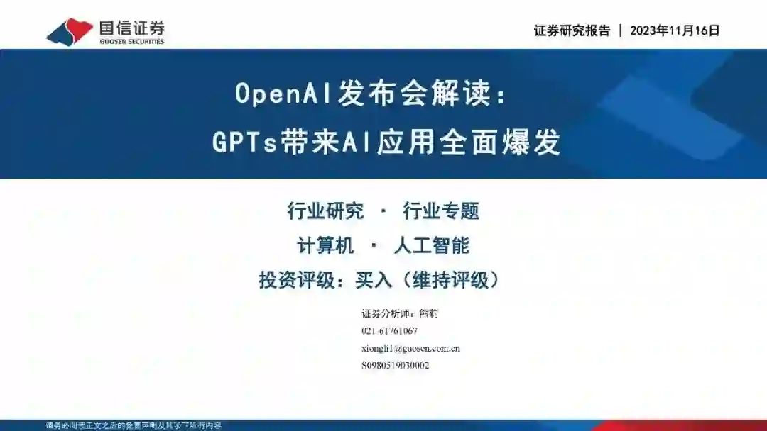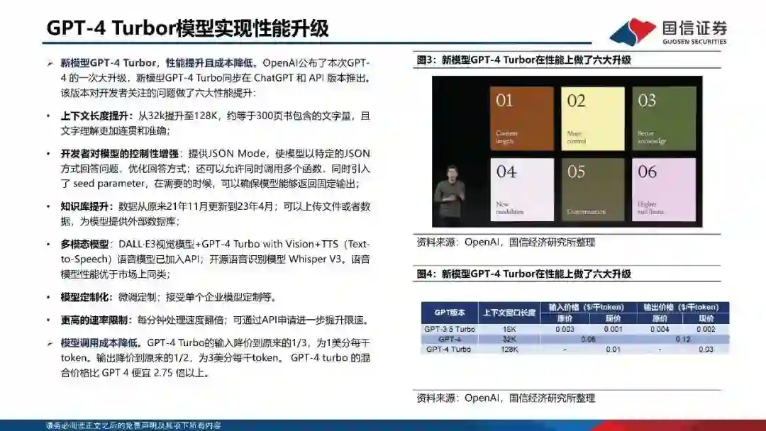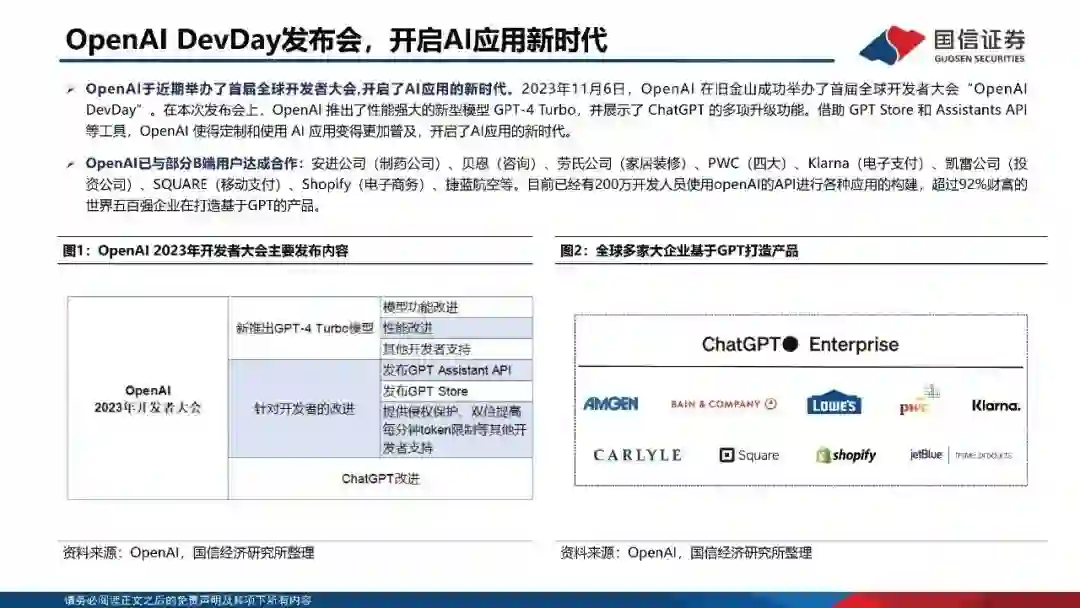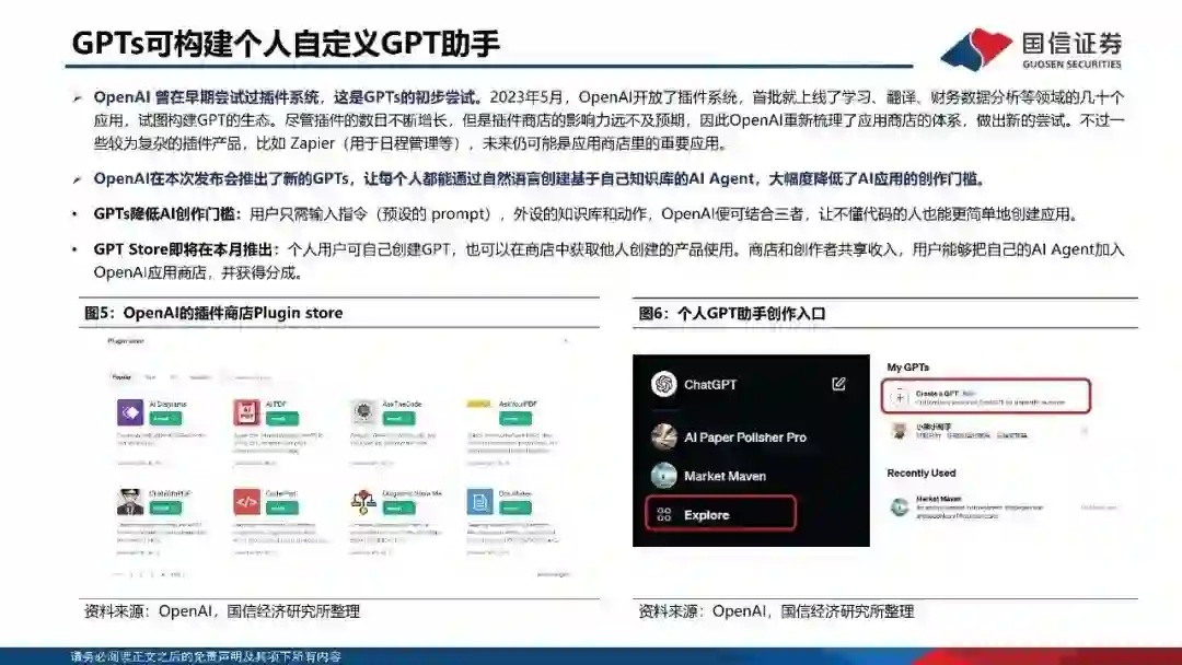 OpenAI在2023年11月份举行中首届全球开发者大会“OpenAIDevDay,展示了GPT系列新产品。 2023年11月6日OpenAI举办在旧金山举办了首届全球开发者大会“OpenAIDevDay”。在大会上,OpenAI的CEO山姆·奥特曼(SamAltman)推出了可支持高达1.28万tokens的新模型GPT-4Turbo以及ChatGPT的一系列升级内容。 新产品的亮点是:1)降本;2)GPTsagent。旨在以更低的价格和更多的工具,助力AI应用实现商业化。 模型成本大幅度降低, GPTs-agent可构建个人自定义助手,带来AI应用全面爆发。 OpenAI推出GPTs,让用户轻松定义GPT。用户只需输入指令(预设的prompt),外设的知识库和动作。OpenAI可以结合三者,让不懂代码的人也能更简单地创建应用,降低了用户使用门槛。 Agent生态带来定制GPT全球大爆发,增长速度远超预期。GPT成为大模型的“操作系统”,改变现有AI应用的格局。