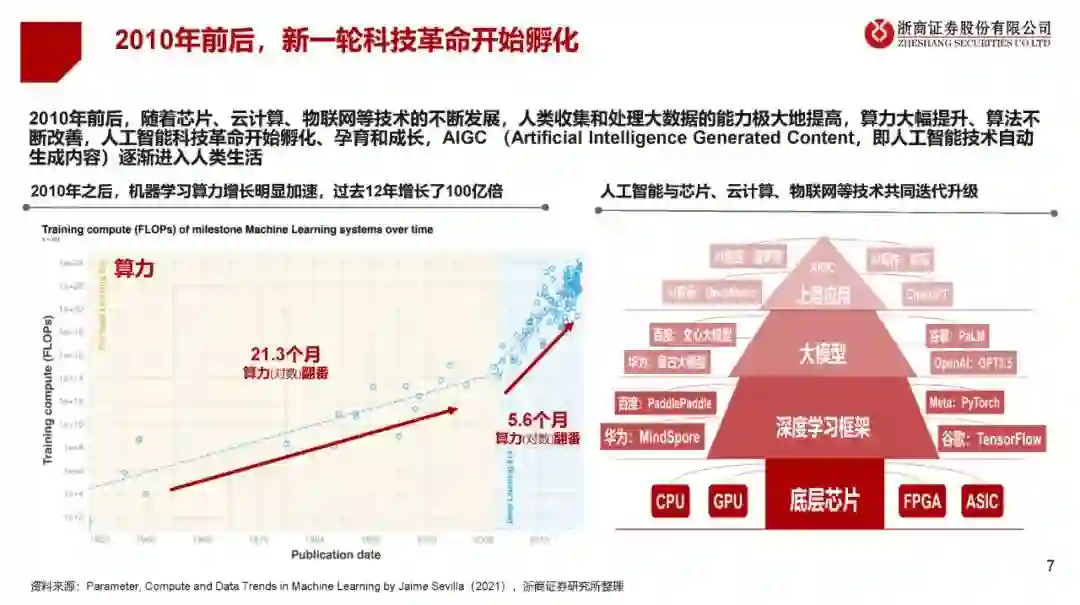 01ChatGPT是全要素生产率提升的核心 ChatGPT将显著提升我国全要素生产率 全要素生产率(Total Productivity Factor,TFP)由技术创新、技术效率、规模效率和配置效率等因素决定,未来随着我国进入高质量发展阶段,TFP的改善可有效对冲人口老龄化带来的压力,TFP决定了我国潜在增长中枢。 ChatGPT在很多传统领域会产生劳动力替代,但也会产生很多新的就业机会。2004年之后,中国从刘易斯的二元经济发展阶段进入到新发展阶段,农村人口从过剩变为短缺,劳动年龄人口占总人口的比重开始下降。 ChatGPT可与人类开展连续对话,ChatGPT可胜任报告起草、诗歌创作、代码撰写等复杂任务。通过“学习”和“理解”人类语言,标志着人工智能技术应用将进入快车道。通过对超过1万亿个人类词汇和1700亿个模型参数进行高效迭代训练,ChatGPT具备强大的自我学习、推理和归纳总结能力。 02ChatGPT是人工智能科技革命的缩影 ChatGPT是人工智能科技革命的缩影 ChatGPT是人工智能科技革命的缩影。实际上,2010年前后,以人工智能、云计算、大数据、物联网等组成元素的新一轮科技革命开始孵化、孕育和成长,如智能汽车、新能源汽车已经开始逐步替代传统汽车,广泛地应用生产生活。 ChatGPT可以理解为一个高情商、理性且学识渊博的聊天机器人,归纳学习能力强,但在专业领域尚不具备预测能力,如宏观经济预测、大类资产价格走势等。不过,在可预见的未来,ChatGPT将在养老、教育、医疗、内容创作等领域实现广泛的应用。