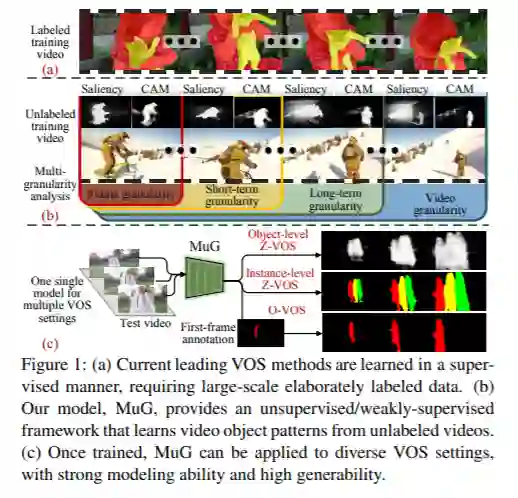 我们提出了一种新的视频对象分割方法(VOS),解决了从未标记的视频中学习对象模式的问题,而现有的方法大多依赖于大量的带注释的数据。我们引入了一个统一的无监督/弱监督学习框架,称为MuG,它全面地捕捉了VOS在多个粒度上的内在特性。我们的方法可以帮助提高对VOS中可视模式的理解,并显著减少注释负担。经过精心设计的体系结构和强大的表示学习能力,我们的学习模型可以应用于各种VOS设置,包括对象级零镜头VOS、实例级零镜头VOS和单镜头VOS。实验表明,在这些设置下,有良好的性能,以及利用无标记数据进一步提高分割精度的潜力。