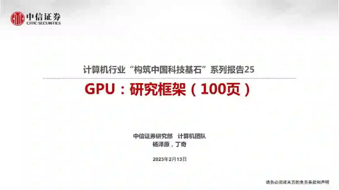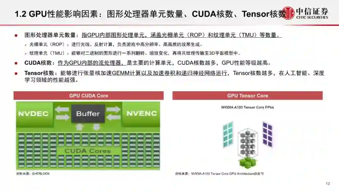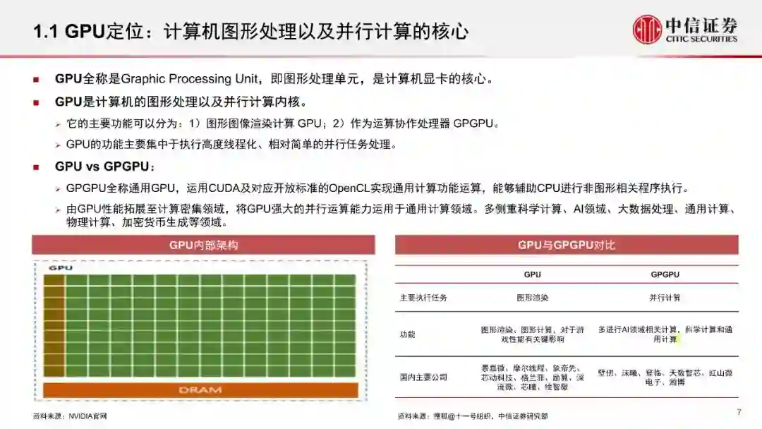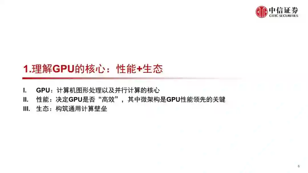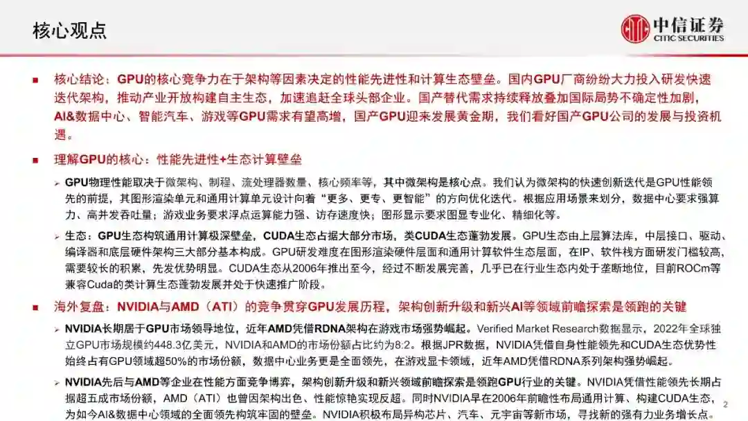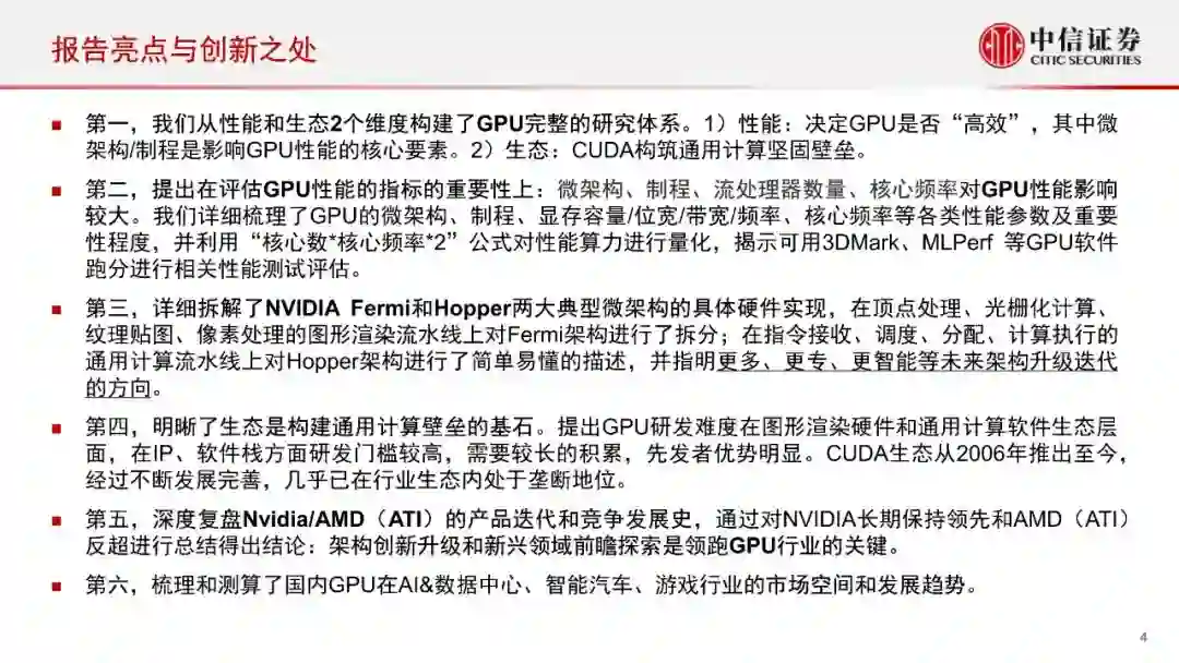 从报告“GPU研究框架(2023)”看,GPU的核心竞争力在于架构等因素决定的性能先进性和计算生态壁垒。国内GPU厂商纷纷大力投入研发快速迭代架构,推动产业开放构建自主生态,加速追赶全球头部企业。国产替代需求持续释放叠加国际局势不确定性加剧,AI&数据中心、智能汽车、游戏等GPU需求有望高增,国产GPU迎来发展黄金期,我们看好国产GPU公司的发展与投资机遇。第一,我们从性能和生态2个维度构建了GPU完整的研究体系。1)性能:决定GPU是否“高效”,其中微架构/制程是影响GPU性能的核心要素。2)生态:CUDA构筑通用计算坚固壁垒。第二,提出在评估GPU性能的指标的重要性上:微架构、制程、流处理器数量、核心频率对GPU性能影响较大。我们详细梳理了GPU的微架构、制程、显存容量/位宽/带宽/频率、核心频率等各类性能参数及重要性程度,并利用“核心数核心频率2”公式对性能算力进行量化,揭示可用3DMark、MLPerf 等GPU软件跑分进行相关性能测试评估。第三,详细拆解了NVIDIA Fermi和Hopper两大典型微架构的具体硬件实现,在顶点处理、光栅化计算、纹理贴图、像素处理的图形渲染流水线上对Fermi架构进行了拆分;在指令接收、调度、分配、计算执行的通用计算流水线上对Hopper架构进行了简单易懂的描述,并指明更多、更专、更智能等未来架构升级迭代的方向。第四,明晰了生态是构建通用计算壁垒的基石。提出GPU研发难度在图形渲染硬件和通用计算软件生态层面,在IP、软件栈方面研发门槛较高,需要较长的积累,先发者优势明显。CUDA生态从2006年推出至今,经过不断发展完善,几乎已在行业生态内处于垄断地位。第五,深度复盘Nvidia/AMD(ATI)的产品迭代和竞争发展史,通过对NVIDIA长期保持领先和AMD(ATI)反超进行总结得出结论:架构创新升级和新兴领域前瞻探索是领跑GPU行业的关键。 第六,梳理和测算了国内GPU在AI&数据中心、智能汽车、游戏行业的市场空间和发展趋势。以下为报告原文,节选部分内容,更多内容请参看原报告“GPU研究框架(2023)”。