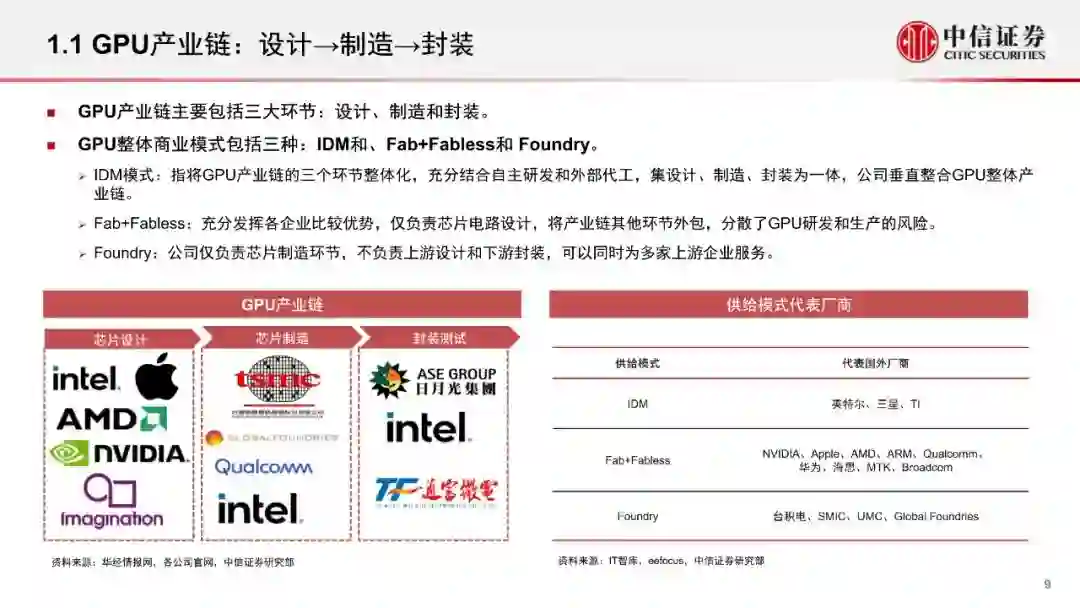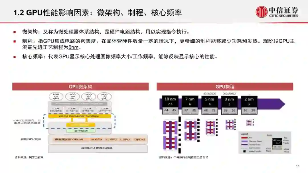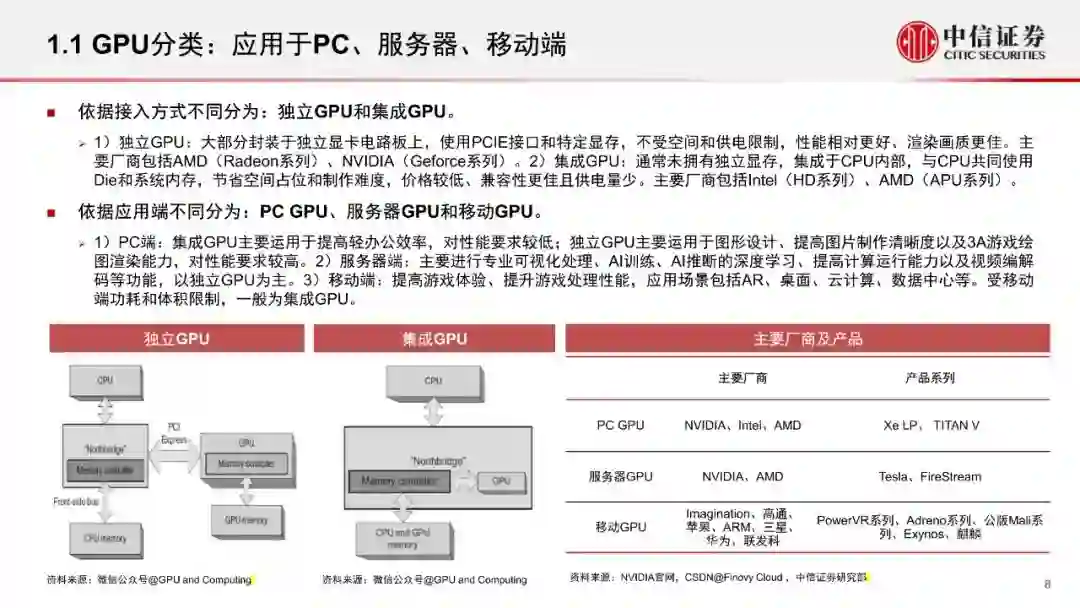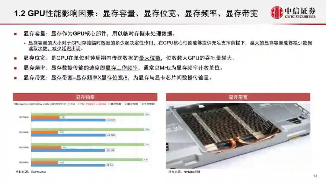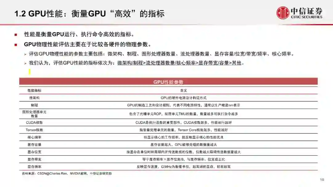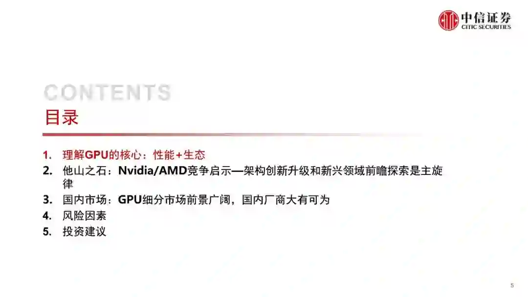 从报告“GPU研究框架(2023)”看,GPU的核心竞争力在于架构等因素决定的性能先进性和计算生态壁垒。国内GPU厂商纷纷大力投入研发快速迭代架构,推动产业开放构建自主生态,加速追赶全球头部企业。国产替代需求持续释放叠加国际局势不确定性加剧,AI&数据中心、智能汽车、游戏等GPU需求有望高增,国产GPU迎来发展黄金期,我们看好国产GPU公司的发展与投资机遇。第一,我们从性能和生态2个维度构建了GPU完整的研究体系。1)性能:决定GPU是否“高效”,其中微架构/制程是影响GPU性能的核心要素。2)生态:CUDA构筑通用计算坚固壁垒。第二,提出在评估GPU性能的指标的重要性上:微架构、制程、流处理器数量、核心频率对GPU性能影响较大。我们详细梳理了GPU的微架构、制程、显存容量/位宽/带宽/频率、核心频率等各类性能参数及重要性程度,并利用“核心数核心频率2”公式对性能算力进行量化,揭示可用3DMark、MLPerf 等GPU软件跑分进行相关性能测试评估。第三,详细拆解了NVIDIA Fermi和Hopper两大典型微架构的具体硬件实现,在顶点处理、光栅化计算、纹理贴图、像素处理的图形渲染流水线上对Fermi架构进行了拆分;在指令接收、调度、分配、计算执行的通用计算流水线上对Hopper架构进行了简单易懂的描述,并指明更多、更专、更智能等未来架构升级迭代的方向。第四,明晰了生态是构建通用计算壁垒的基石。提出GPU研发难度在图形渲染硬件和通用计算软件生态层面,在IP、软件栈方面研发门槛较高,需要较长的积累,先发者优势明显。CUDA生态从2006年推出至今,经过不断发展完善,几乎已在行业生态内处于垄断地位。第五,深度复盘Nvidia/AMD(ATI)的产品迭代和竞争发展史,通过对NVIDIA长期保持领先和AMD(ATI)反超进行总结得出结论:架构创新升级和新兴领域前瞻探索是领跑GPU行业的关键。 第六,梳理和测算了国内GPU在AI&数据中心、智能汽车、游戏行业的市场空间和发展趋势。以下为报告原文,节选部分内容,更多内容请参看原报告“GPU研究框架(2023)”。