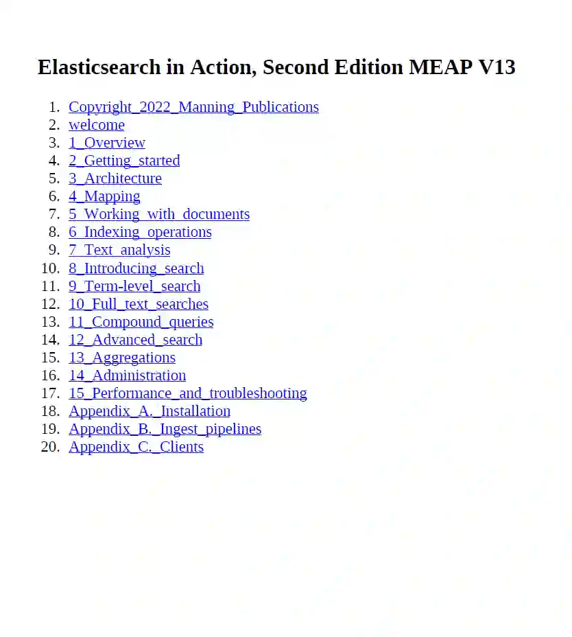 1_概述 2_入门 3_架构 4_映射 5_使用文档 6_索引操作 7_文本分析 8_搜索介绍 9_术语级搜索 10_全文搜索 11_复合查询 12_高级搜索 13_聚合 14_管理 15_性能和故障排除 附录_A._安装 附录_B._摄取管线 附录_C._客户端