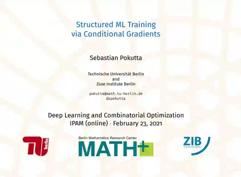条件梯度法是在(组合)多面体上最小化(非)光滑凸函数的一类重要方法。最近这些方法受到了很多关注,因为它们允许结构优化,从而学习,将潜在的多面体结构纳入到解决方案中。在这次演讲中,我将概述这些方法及其应用,并介绍一些在传统优化和学习以及深度学习方面的最新成果。
