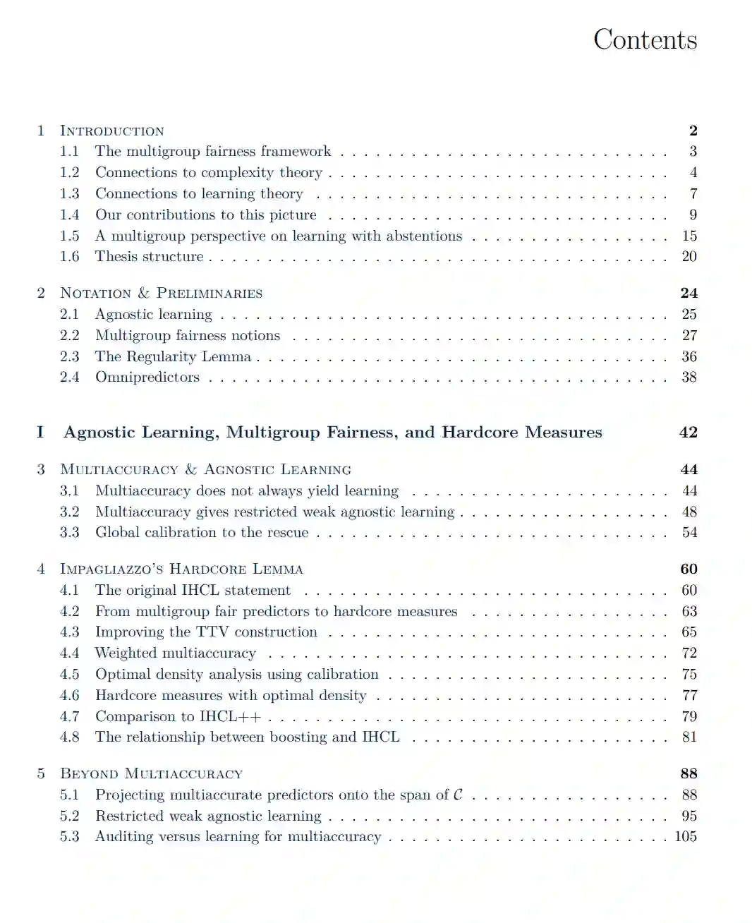 在本论文中,我们研究了预测算法中多群体公平性框架的学习理论与复杂度理论基础。多准确性(Multiaccuracy)多校准性(Multicalibration)是两种主要的多群体公平性概念,它们分别确保在指定计算类可识别的每个子群体中,预测结果是准确且经过校准的 [HKRR18]。这两者均可通过单一的学习原语——弱不可知学习(Weak Agnostic Learning)来实现。自 [GKR+22] 开始的一系列研究表明,多校准性蕴含了一种极强的、基于不可区分性的学习形式,称为全能预测(Omniprediction)。此外,通过正则化引理(Regularity Lemma)及其多种推论,多群体公平性框架与复杂度理论也存在深层联系 [CDV24]。 我们深入探讨了多群体公平性概念、弱不可知学习这一核心学习原语,以及复杂度理论中基础性的硬核引理(Hardcore Lemma)之间的关联。研究发现,多准确性本身能力较弱,但引入全局校准(Global Calibration)后(此概念称为校准多准确性),其效能显著提升,足以恢复此前仅在更强的多校准性假设下才成立的推论。