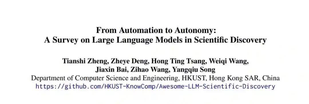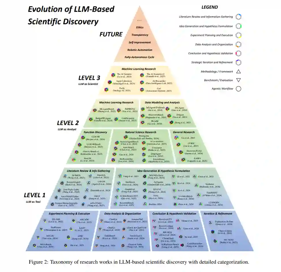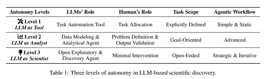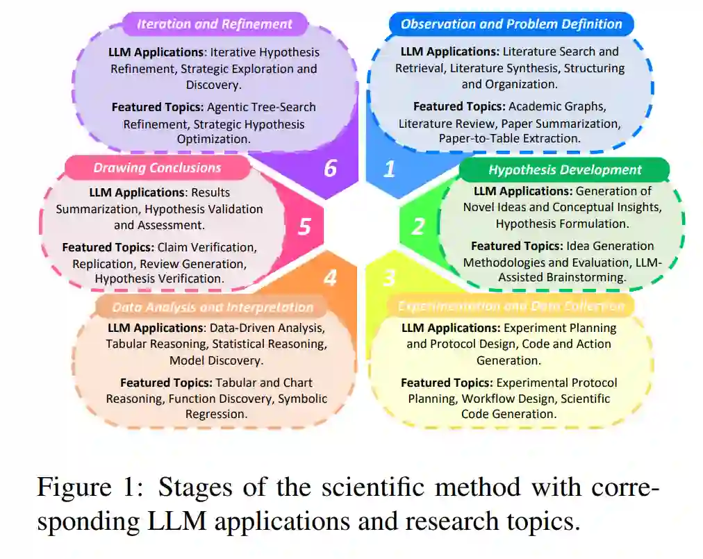 大型语言模型(LLMs)的持续进步催生出一系列新兴能力,如规划(Huang 等,2024b)、复杂推理(Huang 和 Chang,2023)以及指令遵循(Qin 等,2024)。此外,将代理型工作流(agentic workflows)整合进来,使得基于LLM的系统能够执行更高级的功能,包括网页导航(He 等,2024)、工具使用(Qu 等,2025)、代码执行(Jiang 等,2024a)和数据分析(Sun 等,2024)。在科学发现领域,这种高级LLM能力与代理机制的融合正推动一场深刻的范式转变。该转变不仅有望加速科研生命周期,还将从根本上改变人类研究者与人工智能在知识探索中的协作关系。 然而,LLM应用的迅猛扩展及其在科学发现中所引发的范式变化,也带来了诸多挑战。LLM演化速度之快,以及其与复杂科研流程的深度融合,使得系统性的评估愈发困难,因此亟需结构化的概念框架来整理当前认知,并指引未来发展方向。尽管现有综述已对LLM在多个科学领域的应用进行了有价值的概览(Zhang 等,2024, 2025),或对科学中的特定AI技术进行了分类(Luo 等,2025;Reddy 和 Shojaee,2025),但它们往往聚焦于特定学科的应用,或仅呈现LLM能力的静态快照。因此,这些综述可能忽略了LLM自主性不断增强的关键趋势,以及其在整个科学方法流程中角色的动态演变,从而未能充分揭示其影响力的广度与未来向更高独立性演进的潜力。 为系统描绘这一演进图景,并弥补上述空白,本文的分析框架以经典科学方法的六个阶段(见图1)为基础(Popper,1935;Kuhn,1962):(1)观察与问题定义,(2)假设提出,(3)实验与数据收集,(4)数据分析与解释,(5)得出结论,(6)迭代与优化。我们对LLM在这些阶段中的应用进行分析,发现一个显著趋势:LLM正从在单一阶段执行离散的、面向任务的功能,逐步发展为能贯穿多个阶段的复杂代理型系统。值得注意的是,最新研究(Schmidgall 等,2025;Yamada 等,2025)正在探索几乎能够自主完成整个科学流程的LLM系统。 为了更有效地捕捉与描述LLM能力与独立性日益增强的演化路径,本文提出一个基础性的三层级分类框架(见表1),用于定义LLM在科学发现中的不同角色:(i)工具型LLM(LLM as Tool):模型在直接监督下完成具体、明确的任务,辅助人类研究者;(ii)分析者型LLM(LLM as Analyst):模型具备更高的自主性,能够处理复杂信息、执行分析并提供洞见,减少人工干预;(iii)科学家型LLM(LLM as Scientist):代表更高级阶段的系统,能够自主执行从假设构建到结果解释及提出后续研究方向等主要科研流程。 在此分类体系基础上,我们进一步识别出当前研究格局中的关键空白,并提出未来发展的核心挑战与方向,包括:(1)实现无需人工干预的全自主科学发现流程;(2)将机器人自动化引入实验室,实现物理世界的交互与操作;(3)基于以往研究经验实现持续的自我改进与适应;(4)提升LLM主导科研的透明度与可解释性;(5)建立符合伦理与社会价值的治理机制。解决上述多维挑战,将是实现AI作为科学探索变革性合作伙伴的关键。