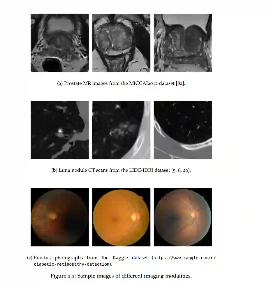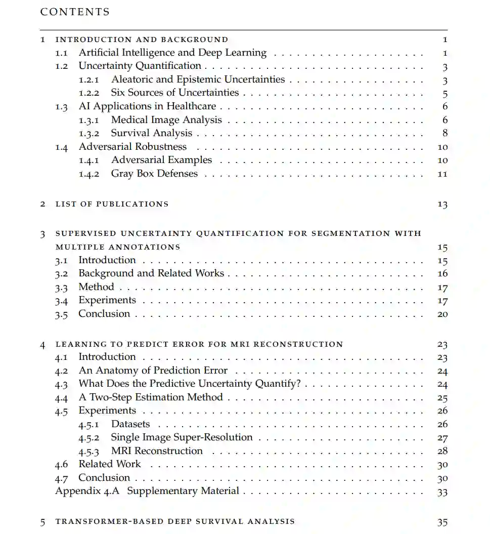 **本文共分为4个独立章节,分别研究面向医学图像分割与重建的不确定性量化方法、面向生存分析的鲁棒深度模型和新的灰盒对抗防御算法。**该论文结合了理论和实证结果,包含了医疗健康中的两个应用,即医学图像分析和生存分析。**在第3章和Hu et al.[54]中,提出了一种新的医学图像分割的监督不确定性量化方法。利用多级标注的可变性作为"基础真相"偶然不确定性的来源,并将其视为监督学习问题中的目标。**我们将这种基本事实的不确定性与概率U-Net[69]相结合,并在LIDC-IDRI肺结节CT数据集[5,6,20]和MICCAI2012前列腺MRI数据集[82]上进行测试。我们发现,我们能够改进预测的不确定性估计。我们还发现可以提高样本精度和样本多样性。**在第4章和Hu、Pezzotti和Welling[53]中,我们提出了一种新方法,可以准确评估医学图像重建模型的预测精度。**首先,通过将预测误差分解为随机误差和系统误差,证明当前方法估计的预测不确定性与预测误差不高度相关,并表明前者等价于随机误差的方差。目前的方法通过修改模型结构和训练损失来联合估计真实目标和数据的不确定性,从而不必要地损害了性能。分别估计它们而不进行修改可以提高性能。接下来,建议分两步估计目标标签和预测误差的大小。在一个大规模的MRI重建数据集[127]上展示了所提出方法,取得了比最先进的不确定性估计方法更好的结果。