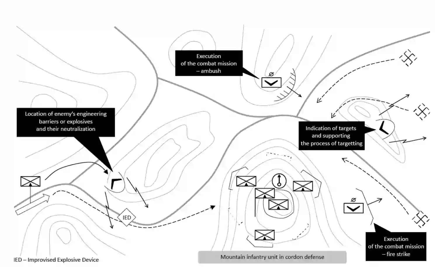 在山地作战的部队可利用无人作战资产进行观察、侦察和收集信息,以便清楚地了解有效决策所需的战术情况。通过主要使用无人机,指挥官可以扩大侦察和观察行动的范围,并提高向指挥所或指挥点传输数据的速度。上述任务的一部分可以从士兵手中接过来,而士兵以前是在战场上执行这些任务的[4,第 185-186 页]。
