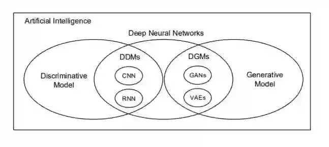 在过去的几年里,计算能力的提高使得深度神经网络在各种应用中取得了成功。在这一类别中,有两类深度学习模型:生成型和判别型。生成模型拟合我们可以在我们的世界中观察到的数据,比如貌似真实的人脸照片[1]。总的来说,这些被称为深度生成模型(DGMs)。另一种是将观察到的数据分成不同的类,如人脸识别、推荐系统等[2]。这类模型被称为深度判别模型(DDMs)[3]。最流行的DGM是生成对抗网络(GANs)[4]和变分自动编码器(VAEs)[5]。两者都广泛用于生成真实的照片[6],合成视频[7],翻译一个图像到另一个[8],等等。与传统DDMs一样,递归神经网络(RNN)[9]、卷积神经网络(CNN)[10]及其变体在情绪分析[11]、图像识别[12]、自然语言处理[13]、[14]等方面表现良好。AI景观关系图如图1所示。