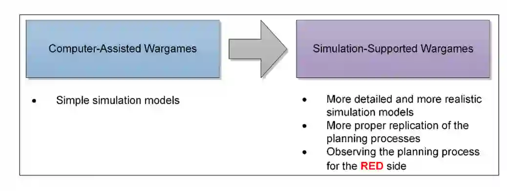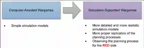 自2010年以来,我们的兵棋推演逐渐从计算机辅助的兵棋推演(使用非常简单的仿真模型),向使用更详细和更真实的仿真模型的兵棋推演演变。此外,为了更密切地了解部队结构的威慑效果(这在实际游戏中可能无法观察到),我们的重点也转向了更恰当地复制规划过程,特别是监测红方部队的规划过程。图2说明了我们兵棋推演的演变过程。