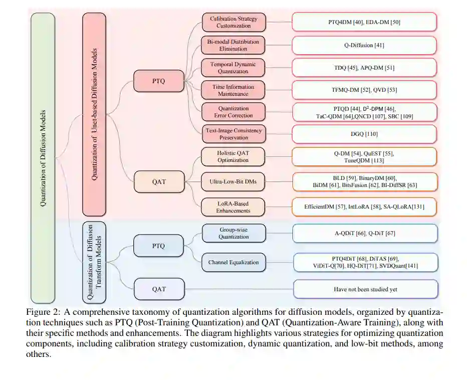 首份扩散模型量化领域的系统综述:据我们所知,本文为首篇全面回顾扩散模型量化研究进展的综述性论文,涵盖截至 2025 年 3 月的最新研究成果,填补理论与实践之间的空白。 * 对扩散模型量化挑战的深入剖析:首次系统归纳了扩散模型量化中的关键挑战,涵盖模型结构(如U-Net中的跳跃连接、Transformer中的注意力机制及前馈网络、文本到图像模型中的多模态对齐)及独立于架构之外的多步采样过程引发的问题。 * 完整的量化方法分类体系:构建了全面的分类框架,涵盖基于 U-Net 和 DiT 的所有主流后训练量化(PTQ)与量化感知训练(QAT)方法,并介绍了如校准采样策略、动态激活、误差修正、分组策略与通道均衡等核心机制。 * 定量基准测试与定性分析:在多个公开任务上对开源方案进行系统评估,结合视觉分析探讨量化误差带来的伪影与其规律,并通过实证实验予以验证。 * 未来研究展望:分析当前扩散模型框架下仍面临的挑战,提出潜在研究方向,如与高级训练策略的结合、向量量化跨模态优化等。