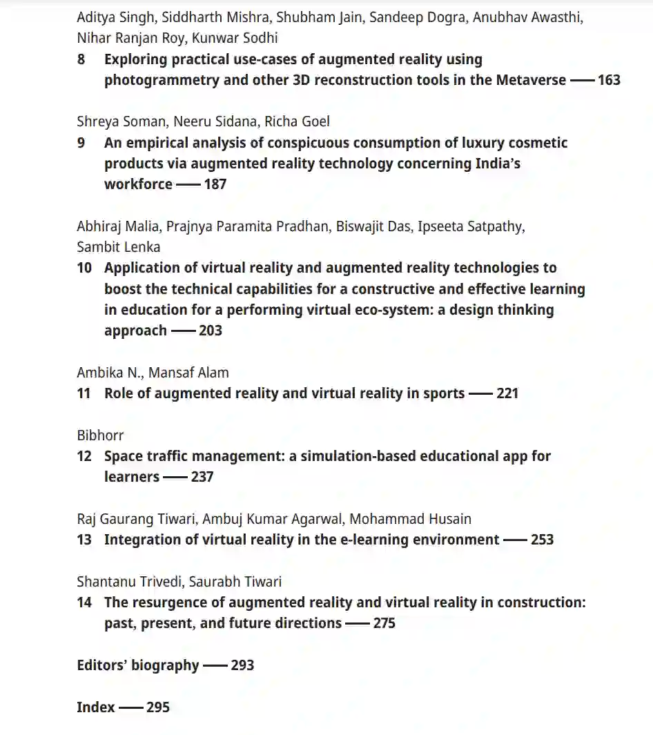 这本编辑卷集合了一系列关于增强现实和虚拟现实在工业应用中的最新发展的研究。每一章都概述了增强现实和虚拟现实在理论和应用方面对不同的技术、工业和社会领域的最新进步。因此,这本书对研究人机交互在工业5.0中的作用做出了贡献。探索增强现实和虚拟现实在工业和技术中的最新应用。开展了关于人机交互在工业5.0中的研究。特点是来自全球的贡献者名单。没有一个行业不以某种方式使用增强现实(AR)或虚拟现实(VR)技术。这种技术的适用性已经涵盖了广泛的行业,并将很快渗透到没人能预见的领域。科技巨头们已经在AR/VR集成上投入了金钱、精力和时间。随着这种技术的发展和扩展,每个人理解AR和VR的多种用途以及其全部潜力至关重要。这本关于“在工业5.0中应用虚拟现实(VR)和增强现实(AR)”的研究书籍揭示了新的和富有创新性的技术方面,以及它们如何有助于提高经济效率和效益以改进生产。它是研究人员、学者、政治家、商业高管、公司和学生的优秀资源,因为它涵盖了广泛的问题。许多改进工业技能和决策制定的AR和VR应用正在获得关注。AR支持技术的指数增长为工业5.0服务增强提供了支持。同时,在许多行业的进步和实时应用中,AR和VR的实际困难在构建认知工具和分析工具中起着关键作用。AR/VR对人工智能(AI)的影响似乎将被视为重要。下一代AR/VR设备将提供定制的、易于访问的和设计精良的体验。然而,这些技术在广泛应用之前还需要更多的努力,这在本书的多章内容中已经在工业5.0的背景下进行了讨论,因为未来的AR/VR设备将提供定制的、易于访问的和设计精良的体验。在这个新常态中,AR和VR正在获得关注。AR/ VR将帮助人们接入元宇宙——互联网的下一代。随着硬件设备变得更加便宜,包括游戏、健身和社交在内的一些突破性的使用案例已经看到了早期市场的接受。这本书以对读者友好的方式写成,包含了大量经过深入研究的重要内容,使得对主题的理解变得简单。本书为读者提供了资源,使他们能够进行更深入的研究。案例研究将提供一种经过验证的方法来解决该研究领域中的常见问题。