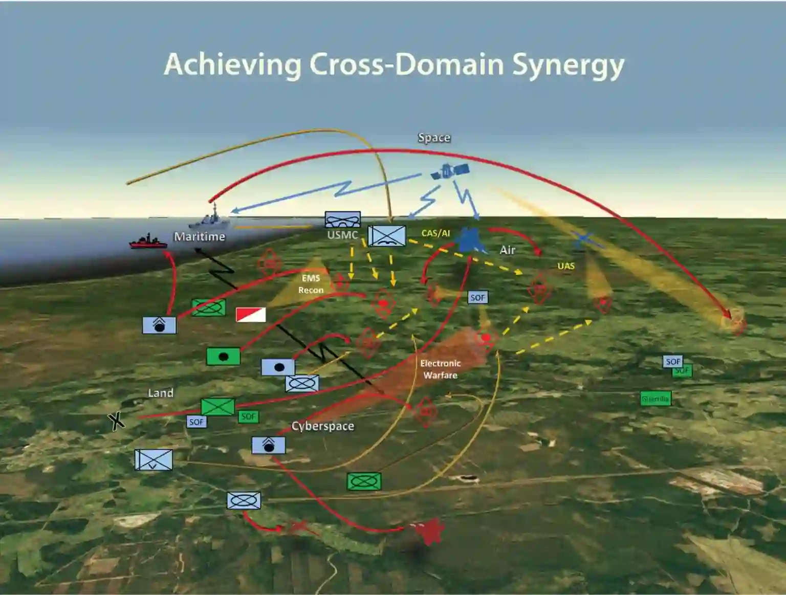 多域作战则基于相反的假设,即利用各领域(有形或无形)的能力来支持各领域优先组成部分的作战计划。举个例子:防空火力或海岸防御会使这些火炮系统影响其目标所在的海域或空域;但它们不一定会与自己的空军和海军舰队协调这一行动,特别是在时间矢量上,以获得作战优势。然而,炮兵可以削弱敌方的区域防空防御,从而使我方空军或我方巡航导弹攻击能够越过防空防御以追击目标,这就是多域作战的一个例子,如果这两种行动由一个共同的指挥部协调并有利于联合作战规划(OPLAN)的话。