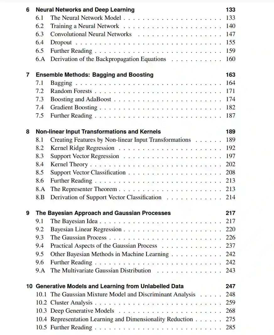 机器学习是关于基于数据学习、推理和行动的。这是通过构建计算机程序来完成的,这些程序处理数据,提取有用的信息,对未知属性进行预测,并建议采取行动或做出决定。将数据分析转化为机器学习的原因是,这个过程是自动化的,计算机程序是从数据中学习的。这意味着使用通用的计算机程序,这些程序根据观察到的所谓的训练数据自动调整程序的设置,以适应应用程序特定的情况。因此,可以说机器学习是一种示例编程方式。机器学习的美妙之处在于数据表示的是非常任意的,我们可以设计出适用于不同领域的广泛实际应用的通用方法。我们通过下面的一系列例子来说明这一点。 本书旨在传达监督式机器学习的精神,而不要求读者具备该领域的任何经验。我们的重点是基础数学和实践方面。这本书是教科书;它不是参考工作或编程手册。因此,它只包含仔细(但全面)选择的有监督机器学习方法,而没有编程代码。到目前为止,已经有许多编写良好、文档齐全的代码包可用。我们坚信,只要读者对数学及其方法的内部工作有很好的理解,就能将本书与他/她最喜欢的编程语言中的代码包联系起来。 本书从统计学的角度出发,从统计特性的角度来讨论方法。因此,它需要一些统计学和概率论的知识,以及微积分和线性代数。我们希望从头到尾阅读本书,能让读者成为机器学习工程师和/或在该主题中进行进一步研究的良好起点。这本书是这样写的,可以连续读。然而,本书还有多种可能的阅读路径,根据读者的兴趣有更多的选择。图1 - 6说明了这两章之间的主要依赖关系。特别是,第2章、第3章和第4章讨论了最基本的主题。我们建议读者在阅读后续章节(第5章至第9章)之前,先阅读这些章节。第10章将超越机器学习的监督式设置,第11章将重点放在设计一个成功的机器学习解决方案的一些更实际的方面,与前几章相比技术性较低。最后,第12章(由David Sumpter撰写)讨论了现代机器学习中的一些伦理问题。