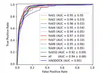 应用1-对接模型的打分。 在BM5数据上进行10折交叉验证后,作者发现其中8折的表现都好于HADDOCK打分函数(如图2所示),其AUC值均大于等于0.95,但表现出了明显的数据集依赖性。为了更好的体现出模型优秀的打分能力,作者进一步计算了fnat与预测值的斯皮尔曼相关系数,均值0.49±0.14鲜明地体现了模型的优异性能。作者还在CARPI数据集上与其余软件进行了比较,如表所示,DeepRank-GNN在AUC于Top100的成功率上均取得了最好的表现。最后,作者验证了方法在性能上的优势,相较于DeepRank,本文提出的方法在存储与速度上都展现出大幅的超越。