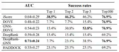 应用1-对接模型的打分。 作者在BM5数据集上训练模型,在CAPRI数据集上测试模型效果。在这一部分,作者设计了一个基于GNN的网络结构并命名为GINet(如图1B所示),以fnat (the fraction of native contacts)为训练目标构建回归任务,并计算了AUC、命中率与成功率作为评估标准。