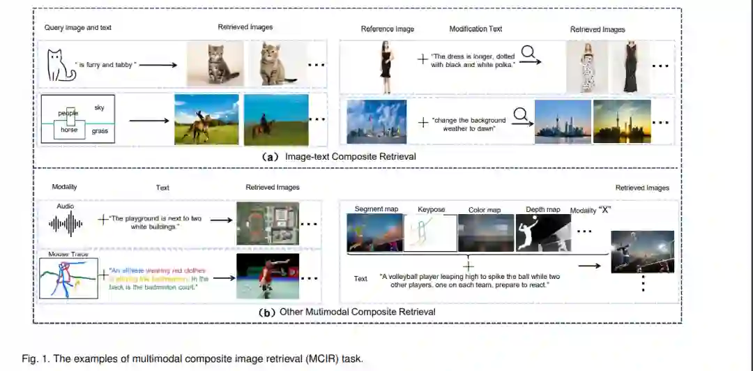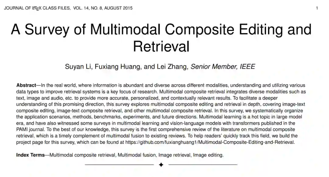 在现实世界中,信息跨越不同模态且种类繁多,理解并利用多种数据类型来改进检索系统是研究的关键重点之一。多模态复合检索集成了文本、图像、音频等多种模态,以提供更精准、个性化和上下文相关的结果。为了促进对这一有前景方向的深入理解,本综述深入探讨了多模态复合编辑与检索,涵盖了图文复合编辑、图文复合检索及其他多模态复合检索。本文系统整理了应用场景、方法、基准、实验以及未来方向。在大模型时代,多模态学习是一个热门话题,同时也见证了《PAMI》期刊上关于多模态学习和视觉-语言模型与Transformers的若干综述的发表。据我们所知,本综述是首个关于多模态复合检索的全面文献回顾,是对现有多模态融合综述的及时补充。为了帮助读者快速跟踪这一领域的进展,我们为本综述建立了项目页面,访问地址为:https://github.com/fuxianghuang1/Multimodal-Composite-Editing-and-Retrieval。 关键词——多模态复合检索,多模态融合,图像检索,图像编辑。
