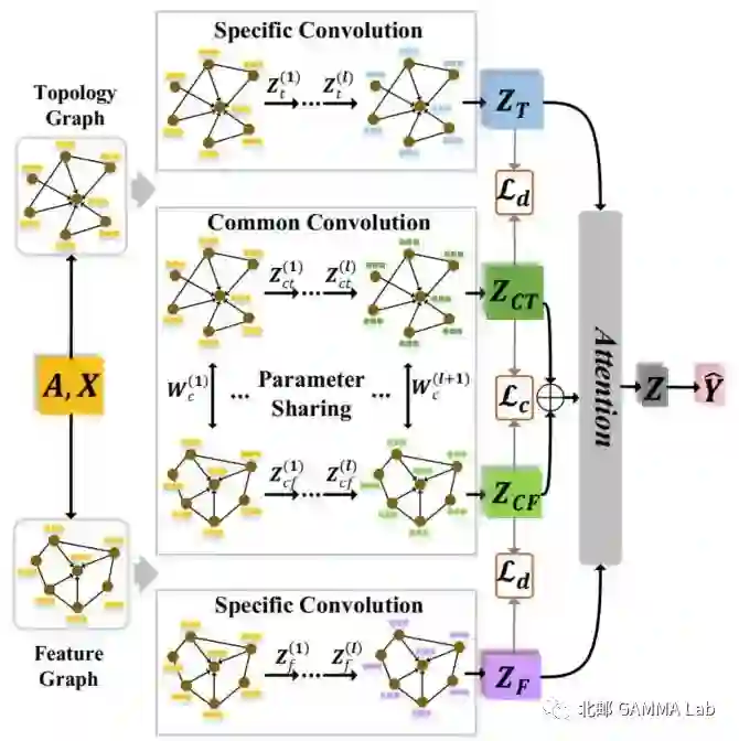 针对这些问题,我们提出了一种灵活地用于半监督节点分类的自适应多通道图卷积网络方案。其核心思想是同时学习基于节点特征、拓扑结构及其组合的节点嵌入,并依据特征与结构之间的相似性对标签预测的作用往往是互补的这一事实,采用设计的自适应融合机制来获取对分类任务最有帮助且最深层次的相关信息。