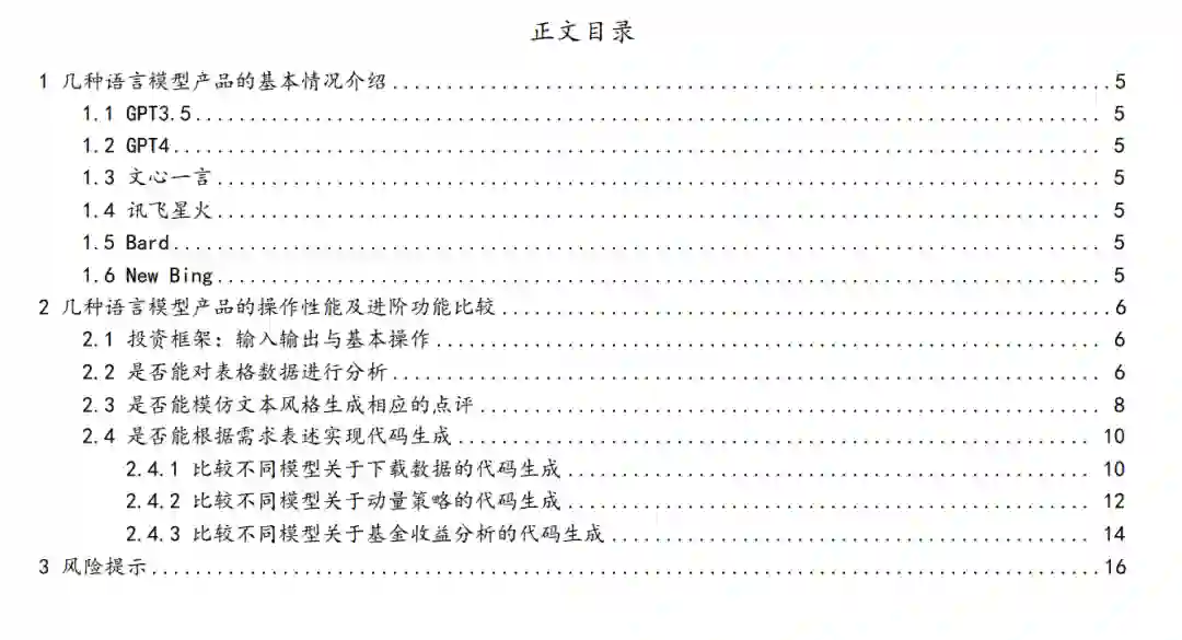 本文简单介绍了几个关注度较高的大语言模型产品,包括 GPT3.5、GPT4、 文心一言、讯飞星火、Bard 和 New Bing,并比较了不同语言模型的操作性 能及代码应用等方面的差异。 GPT3.5 和 GPT4 是 OpenAI 的产品,基于 Transformer 架构,以自回归方式 从大量文本中学习预测下一单词,功能包括生成文本、提供问答、写作支持 和翻译等。文心一言是百度开发的基于知识增强的大语言模型,讯飞星火则 是科大讯飞推出的新一代认知智能大模型,能够基于自然对话方式理解与 执行任务。Bard 是谷歌的大型语言模型聊天机器人,使用 LaMDA 模型从高 质量信息源中提取回复内容。New Bing 是微软基于 OpenAI 的 ChatGPT 语言 模型的搜索引擎,具有丰富的搜索和语言交互的能力。 我们总结了几种人工智能语言模型在基本操作和性能方面的差异。通过对 它们的输入、输出和代码能力等方面进行测试和评估,可以看到不同模型之 间存在不同的限制和特点,例如输入限制、中文支持、对表格数据的分析能 力以及代码生成的实现等,因此用户可以根据具体的应用场景和需求来选 择最合适的产品。 此外,我们发现部分模型具备较好进阶功能,如对表格数据的分析和代码生 成能力。在代码生成能力的随机测试过程中,GPT4 和 New Bing 能够较好的 完成某些代码生成任务,相比其他模型有更大的优势。总体而言,这些比较 是为了更好地了解不同模型的操作性能和进阶应用,并为用户选择合适的 语言模型提供参考。