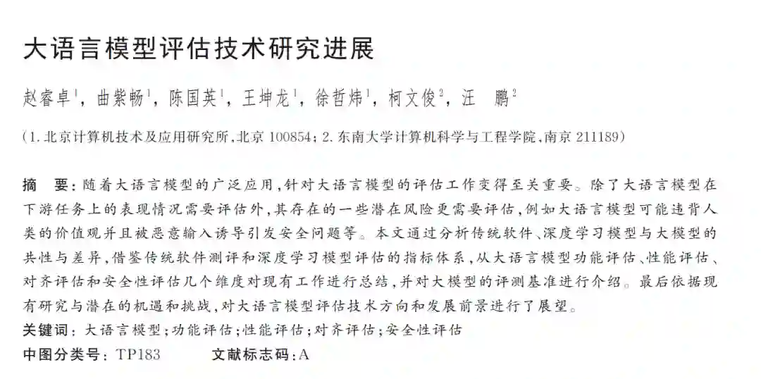 随着大语言模型的广泛应用,针对大语言模型的评估工作变得至关重要。除了大语言模型在下游任务上的表现情况需要评估外,其存在的一些潜在风险更需要评估,例如大语言模型可能违背人类的价值观并且被恶意输入诱导引发安全问题等。本文通过分析传统软件、深度学习模型与大模型的共性与差异,借鉴传统软件测评和深度学习模型评估的指标体系,从大语言模型功能评估、性能评估、对齐评估和安全性评估几个维度对现有工作进行总结,并对大模型的评测基准进行介绍。最后依据现有研究与潜在的机遇和挑战,对大语言模型评估技术方向和发展前景进行了展望。