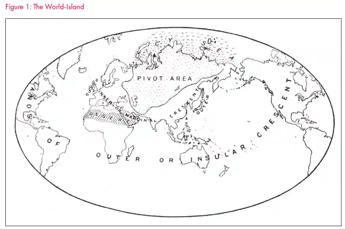 我们可能看到的是一个新的地缘政治格局。中国"一带一路 "倡议有可能将地缘政治战略家Halford Mackinder在1904年描述的 "世界岛"(AfroEurasia或非洲、欧洲和亚洲)统一起来(见图1)。正如麦金德所观察到的,在过去500年里,每一个全球霸主的崛起都是因为对欧亚大陆的主导地位(McCoy 2021)。