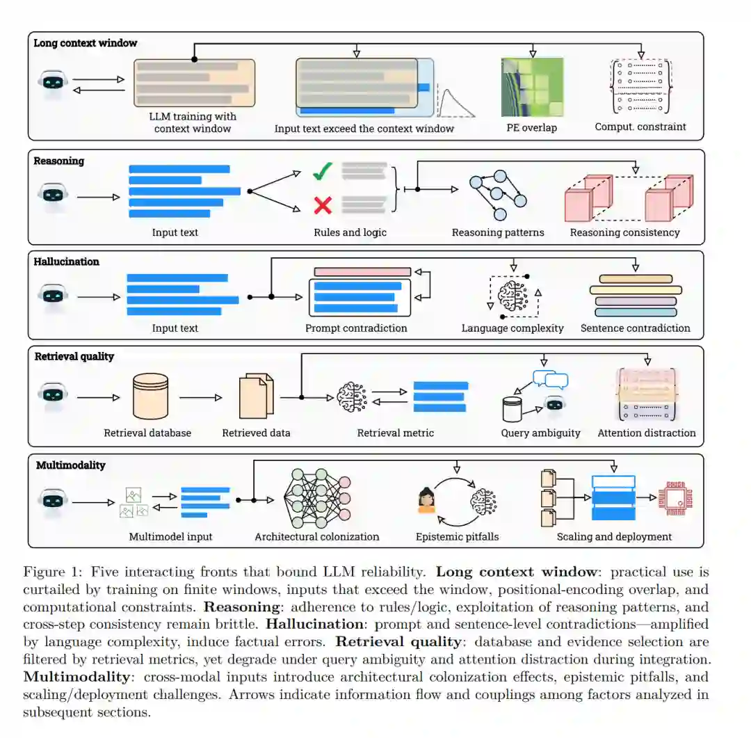 过去五年间,大规模语言模型在规模与影响力上经历了前所未有的爆发式增长。模型参数量、训练数据集和算力预算均呈数量级提升,催生出的模型其涌现能力日益趋近通用推理系统。例如,OpenAI的GPT系列从GPT-1的1.17亿参数,发展到GPT-4的逾万亿参数,表征能力提升逾千倍。实证缩放定律表明,训练损失与下游性能随模型规模、数据量和算力增加而可预测地提升。以从GPT-3.5到GPT-4的转变为例,其在MMLU上的表现提升了16个百分点,在GSM-8K上更是跃升了35个百分点。这些成功催生了一种普遍信念,即规模本身能够无限扩展智能,并将所有失败模式都归结为可通过更多数据、参数或对齐来解决的工程障碍。 然而,随着模型步入万亿参数级别,驱动其成功的进程也暴露出规模所无法克服的根本性局限。更大的模型不仅性能更好,其失败也更为"自信":它们以日益系统化的方式产生幻觉、错误推理、遗忘和失准。即使在庞大数据下,这些痼疾依然存在,暗示着其背后更深层的计算与统计根源。本文认为,这些行为并非优化或数据筛选的暂时性缺陷,而是内在理论壁垒的体现,这些壁垒由可计算性、信息论及可学习性本身所施加。我们归纳了伴随规模扩展而持续存在的五类主要局限: (1)幻觉问题。LLM常生成流畅但虚构的内容。除数据或对齐缺陷外,我们证明幻觉具有必然性:对可枚举模型类的对角线化构造确保了每个模型至少存在一个失败输入;诸如停机问题等不可计算性问题会引发无限失败集;有限信息容量与压缩边界迫使模型对复杂或稀有事实产生失真。因此,任何可计算的LLM都无法在开放域查询中保持普适正确性。 (2)上下文压缩。即便拥有128K令牌的上下文窗口,位置编码训练不足、表征饱和及Softmax拥挤效应共同限制了有效上下文利用率,使其远低于名义容量。稀有位置的梯度衰减、正弦/RoPE编码的信号重叠消失,以及对数形式的分数边际增长,均表明有效上下文长度随名义长度呈次线性缩放。 (3)推理能力退化。尽管表面流畅,LLM更倾向于关联补全而非真值推理。基于似然的训练奖励局部连贯性而非逻辑蕴涵,导致产生句法而非语义的泛化。令牌级优化目标与显式推理损失的缺失,共同导致了分布外情境下系统性的"推理崩溃"。 (4)检索脆弱性。检索增强模型继承了理论脆弱性:有限的令牌预算引发语义漂移、排序噪声及检索文本与生成文本间的弱耦合。从信息论视角,随着检索广度增加,其与目标之间的互信息会衰减,从而为事实锚定设定了上限。 (5)多模态失准。视觉-语言联合模型存在跨模态不平衡:语言通道主导梯度,而视觉特征适应不足。不同的模态熵及未对齐的潜空间流形会导致感知错觉与符号混淆,表明多模态缩放放大了而非消除了单模态的脆弱性。 纵观这些维度,我们揭示了一个统一原理:LLM的失败随其能力而扩展,因为它们根植于语言建模本身的理论基础。每种失败模式都反映了同一底层三重限制的投射:计算不可判定性、统计样本不足及有限信息容量。尽管已有大量实证记录,先前综述仍停留在描述性层面,缺乏将这些观察与计算及学习的数学基础相联系的正式综合。我们通过一个基于证明的框架填补了这一空白,该框架推导出一系列不可行性与饱和性结果,共同刻画了规模扩展何时有效、何时饱和以及何时被证明无法推进。具体而言,我们证明了受可计算性与对角线化限制,不存在一个可枚举的模型类能够完全避免幻觉;我们也证明了有限描述长度与样本复杂度导致了不可约减的泛化误差,反映了可学习性的信息论边界;最后,我们还证明了上下文、推理、检索及多模态锚定各自遵循由架构约束与数据熵决定的可识别退化规律。 这些成果共同将规模扩展重新界定为一个受内在计算与认知约束限制的过程,而非一个无界的工程问题。本文余下部分将系统性地形式化每一局限:第2节证明幻觉的必然性;第3节推导长上下文压缩定律;第4节分析推理与复述的对立;第5节剖析检索脆弱性;第6节将论证延伸至多模态模型;第7节指出现有评估基准的局限性;第8节综合这些发现,界定在哪些领域进一步的参数、数据或模态扩展将不再带来有意义的进展;最后,第9节总结论文核心要素并展望未来研究方向。