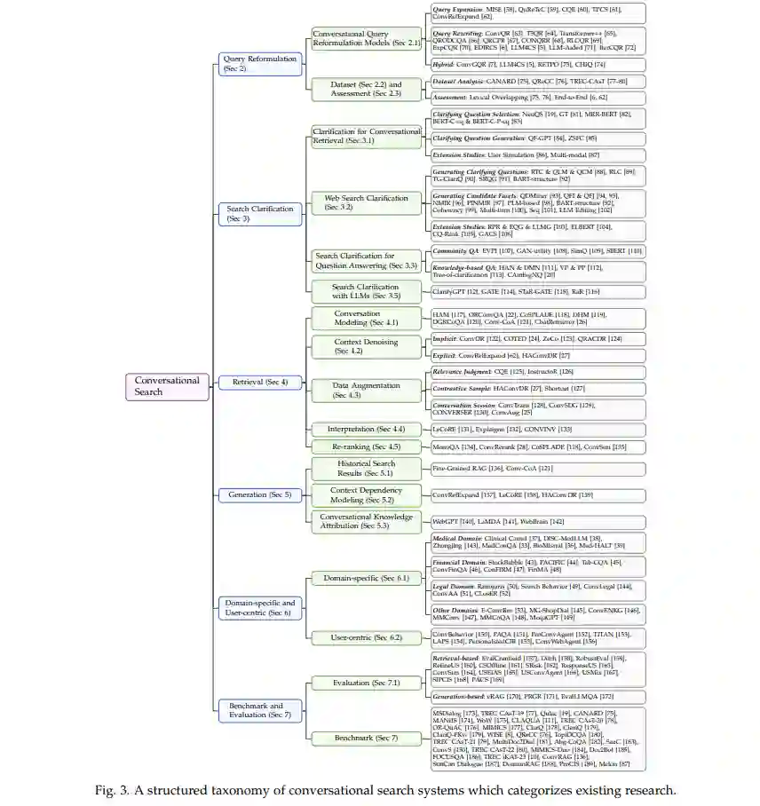 总之,本综述旨在回顾构建会话式搜索系统的关键技术组件,并探讨其在现实世界中的应用。我们将分析查询重构、澄清、会话式检索、响应生成和特定领域的应用,了解这些模块如何协同工作,以实现更加自然和智能的用户交互。此外,我们还将总结现有的资源和评估协议,以推动该领域的进一步研究。我们的目标是为研究人员和工程师提供会话式搜索领域挑战与机遇的全面概述。本文将展示每个阶段的技术挑战,探索当前的解决方案,并概述未来的方向,以鼓励在这一新兴领域的进一步创新和发展。