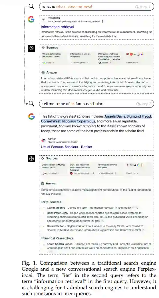 搜索引擎已经成为现代社会不可或缺的一部分,是满足用户信息需求的重要工具。它们的发展在很大程度上得益于人工智能(AI)的进步[1]。近年来,随着自然语言处理(NLP)技术的快速发展,特别是大型语言模型(LLM)的出现[2],搜索引擎逐步演变为提供更智能和互动的用户体验。会话式搜索是该领域中的一个显著进展,这一新兴范式通过自然语言交互为复杂和精确的信息获取提供支持。目前,商用会话式AI搜索引擎,如Perplexity.ai和SearchGPT,已经被广泛部署,迅速吸引了大量用户并保持显著增长。 与依赖关键词或短语的传统搜索引擎相比,会话式搜索利用自然语言对话进行交互[3–7],大大提高了信息交换的效率,并优化了用户体验。这种方法支持更加复杂的用户查询,管理更长、更复杂的历史上下文,并提供综合的信息集成和处理能力。此外,会话式搜索支持多样化的信息交付方式,能够与用户进行主动的交互[8–10]。例如,这些系统可以主动提出澄清性问题[11–13]、进行推荐[14],并通过对话引导用户更好地表达需求。图1展示了传统搜索与会话式搜索的区别。在一个真实的示例中,像Google这样的传统搜索引擎无法在查询之间保持上下文。在用户查询“什么是信息检索”之后,紧接着询问“告诉我一些著名学者”,搜索引擎会给出不相关的结果,因为它没有识别出用户仍然指的是“信息检索学者”。相比之下,Perplexity.ai作为会话式搜索引擎,能够通过保留上下文,正确解读后续问题,并提供关于信息检索领域著名学者的准确信息。