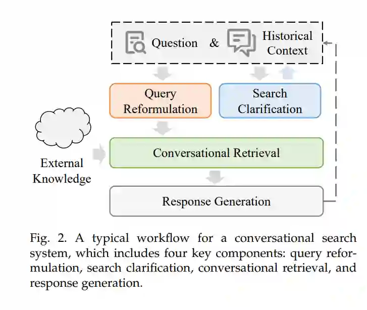 一个典型的会话式搜索系统由多个关键模块组成,每个模块涉及多种先进技术。随着该领域的不断演进,它既带来了重要的机遇,也面临诸多挑战。在本综述中,我们将探索和分析构建会话式搜索系统的最关键组件,按照整个信息流的顺序进行研究。我们重点包括查询重构、搜索澄清、会话式检索和响应生成。这些组件协同工作,支持更加自然和直观的用户与系统交互,从而最终提升整体搜索体验。