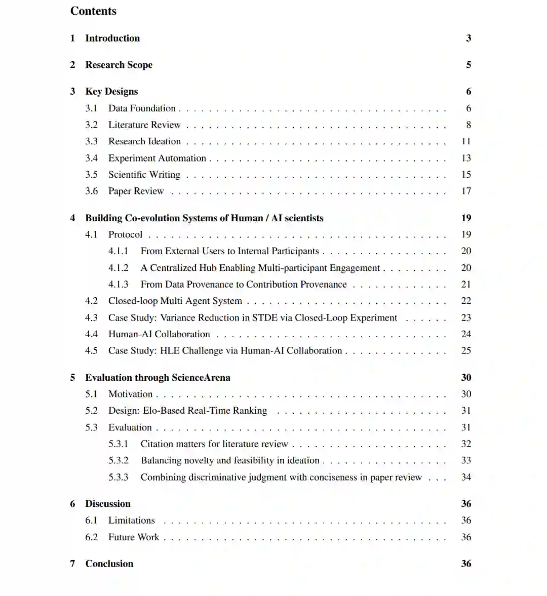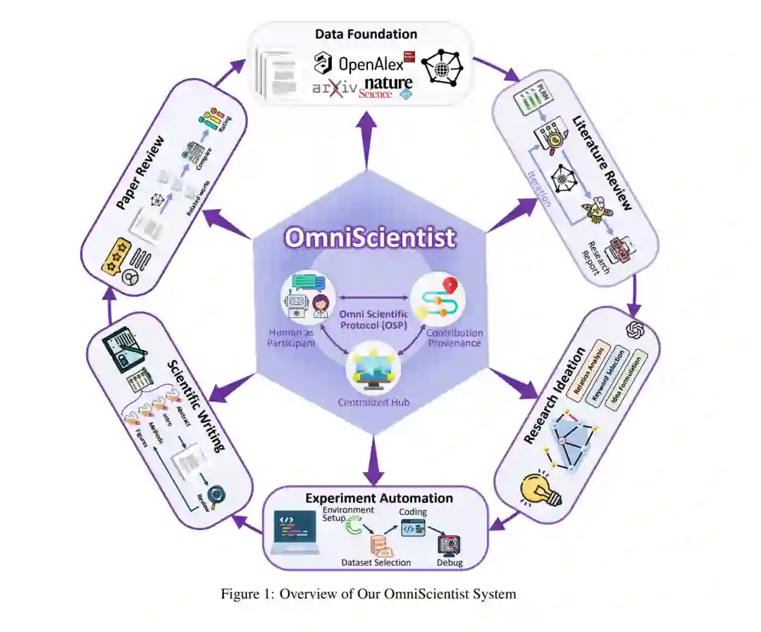 科学实践始终随着工具的演进而变革,从望远镜、显微镜到计算机与算法。如今,大语言模型(LLMs)代表了下一次重大转型。在各个学科中,由 LLM 驱动的智能体已开始协助曾经仅由人类研究者承担的任务:检索海量文献、提出科学假设、撰写报告,甚至设计实验。随着这些能力的不断加深,一个根本性的问题随之而来:AI 能否从单纯的工具演变为科学生态系统中真正的参与者? 构建此类“AI 科学家”[1, 2] 的现有努力已取得显著进展。例如,AlphaEvolve [3] 通过显式数学建模和基于代码的搜索空间探索进行迭代优化;OpenAI Deep Research [4] 则在特定研究课题的引导下,进行广泛的信息检索与综合。Virtual Lab [5] 和 Future House [6] 等系统则向自动化迈出了更远的一步,整合了更全面的 AI 驱动研究工作流,并协调多个工具以完成复杂的科学任务。然而,尽管这些方法表现出高度的复杂性,它们仍主要将科学发现建模为孤立的搜索或优化问题,忽视了一个基本事实:科学研究本质上是一种社会化协作行为,并由复杂的制度性基础设施提供支撑。由于缺乏这些关键维度,现有系统仅能作为孤立的工具运行,难以建立真正的研究生态,亦无法与人类科学社区进行深层次交互。 将人类研究的基础设施整合进来,对于提升 AI 科学智能至关重要。数个世纪的科学进步不仅产生了静态的事实,还沉淀出一套复杂的认知与结构框架。例如,引用网络将孤立的研究发现转化为可追溯的思想脉络,揭示了科学思想的演化路径;同行评审机制作为严格的质量控制手段确保了研究的可靠性;协作协议则规范了贡献与信用的分配。这些结构为科学演化提供了必要的“环境”。如果不对这些底层机制进行显式建模和编码,AI 科学家将始终只是高效的执行者,而无法继承人类科学研究中那种动态、自纠错的特质。 在本文中,我们迈出了第一步,推出了 OmniScientist:一个将人类研究基础设施显式编码进 AI 驱动研究全生命周期的综合性框架。OmniScientist 超越了简单的任务自动化,它模拟了一个完整的科学生态环境。其核心是一个强大的数据基础层,构建于数百万篇全文文献及其元数据之上。这形成了一个捕捉引用关系和知识语境的动态科学网络,作为系统的认知基石。在此基础上,文献综述模块采用多智能体架构进行迭代式、语义引导的探索,确保智能体具备对研究版图的全面认知。在这一语境引导下,研究构思过程利用科学学(Science of Science)[7] 的原理,在引用网络中探索并精炼概念,生成既有背景支撑又具方法论严谨性的新颖假设。在实验自动化方面,系统采用迭代式多智能体循环来生成、评估并优化实验策略,通过严格的反馈机制实现自我优化。实验完成后,科学写作由一个集成框架支持,该框架能够综合相关工作、生成图表,并根据标准学术规范润色文本,产出逻辑连贯、达到发表水平的论文。最后,系统引入了论文评审机制作为质量控制关卡,通过与前人工作的深入对比来评估投稿,提供客观且具建设性的反馈。这些组件并非孤立运作,而是作为一个互联的生态系统,覆盖了科学研究的完整脉络。 此外,为了将这些功能模块转化为一个具有凝聚力和治理能力的生态系统,我们引入了两项关键的基础设施创新。首先,我们提出了 Omni 科学协议(OSP),这是一种标准化的协作骨干网,旨在编排多个 AI 智能体与人类研究者之间的复杂交互。OSP 并不将人类视为被动的观察者,而是允许研究者无缝参与执行与协作过程,在系统需要高层次人类直觉时提供及时的反馈、战略建议或方向修正。为了维护科学诚信,OSP 进一步整合了细粒度的贡献追踪系统。该机制记录了每一个创意、数据集和实验结果的溯源(Provenance),将信用归于特定的智能体或人类参与者,从而建立起一套类似于现代科学贡献者角色的透明署名与问责模型。 其次,针对开放式科学发现评估这一持久挑战,我们开发了 ScienceArena,这是一个旨在模拟社区驱动科学验证特性的开放基准平台。与静态指标不同,ScienceArena 采用盲样成对投票机制,由人类专家根据科学严谨性和新颖性对匿名研究产出进行评估。通过将这些偏好聚合为动态的 Elo 评分,该平台建立了一个反映社区标准演变的实时排行榜,从而有效地允许人类判断积极地塑造 AI 科学智能体的演化方向。 总而言之,这项工作标志着一种范式转移:从设计孤立的研究工具转向构建全面的科学生态系统。通过将人类研究的基础设施显式编码进 AI 工作流,OmniScientist 赋能 LLM 智能体从单纯的任务执行者进化为该社区中的自主参与者。展望未来,我们预见这样一个愿景:AI 科学家将在生态系统内通过持续演化自主提升能力,同时与人类研究者协作,共同拓展知识的边界。