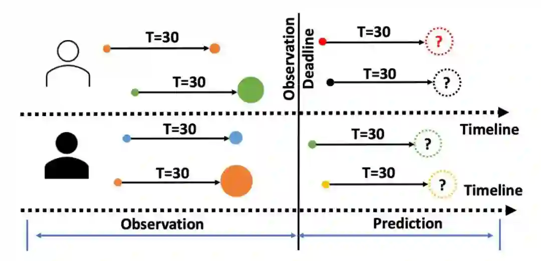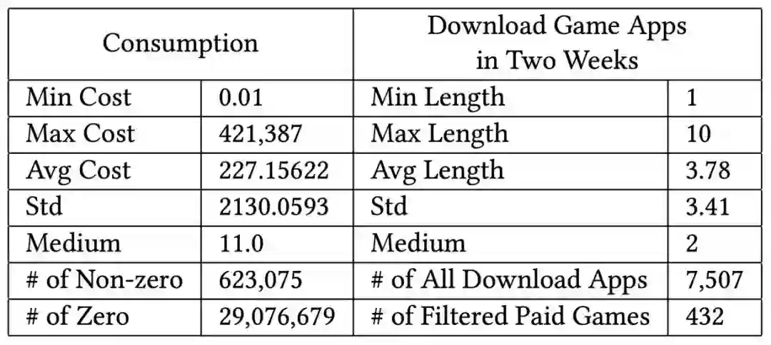 为帮助读者更好地理解我们的研究工作,我们先对现有的业务场景中使用的数据和模型训练以及评估方式进行简单介绍。如图1所示展示了现有的用于研究的训练数据和测试数据。对于每个用户,分别收集了其下载记录,以及下载 30 日内对下载的游戏的付费记录。确定某个观测时间点为训练集和测试集的划分曲线,其中观测observation 区域中的数据被用于训练模型,prediction区域中的数据被用于测试训练得到的模型。不同颜色的圆表示不同的游戏,T=30 表示经过 30 天之后。T=30 之后指示的圆表示用户在目标游戏上的花销金额大小。圆越大表示用户花钱越多。当前任务目标就是预测在观测线之后,用户自下载游戏 30 天后在目标游戏上的花销金额。需要注意的是,现有的业务模型也是基于该框架进行训练的。并且训练得到模型在测试集上相对于真实消费金额的差距被用于评估模型的有效性。具体采用的评估指标是 r2_score,该指标是一个类似 MSE 的指标,用于衡量模型在测试集上的预测消费金额和观测到的真实消费金额之间的差距。 表 1 用户付费数据统计信息