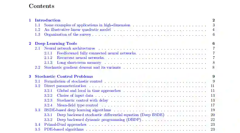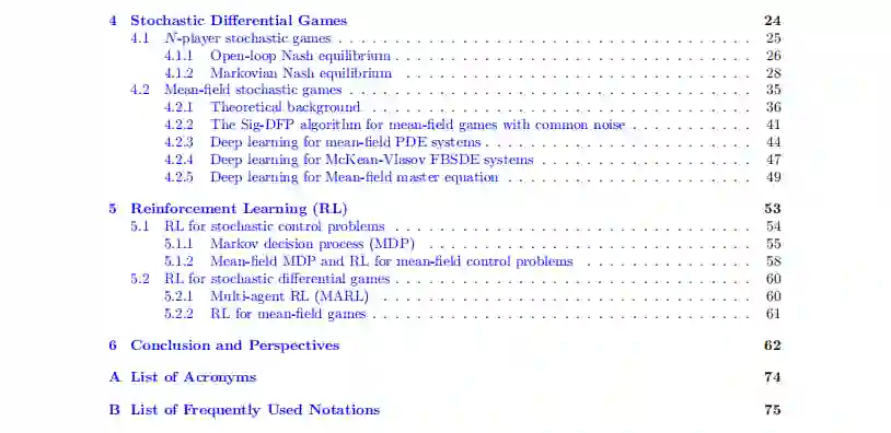 在本调查的其余部分,我们将系统地回顾随机控制和博弈的机器学习方法和理论的最新发展,重点是总结在人工智能和随机分析的交叉点上的最先进的工作。我们还将确定尚未解决的挑战,并将其与实际应用联系起来。作为准备,在第2节,我们首先回顾了现代机器学习的两个主要工具,即神经网络和随机梯度下降。然后,我们在第3节中对机器学习算法和随机控制问题的理论进行了详细介绍和回顾。在第4节中,我们重点讨论随机微分博弈,包括(适度大的)N人博弈和平均场博弈。强化学习方法通常是无模型的,我们在第5节回顾了这些类型的随机控制和博弈的方法。我们在第6节中提出了结论性意见并讨论了未解决的挑战。在附录中,我们总结了本文中所有的首字母缩写词和经常使用的符号。