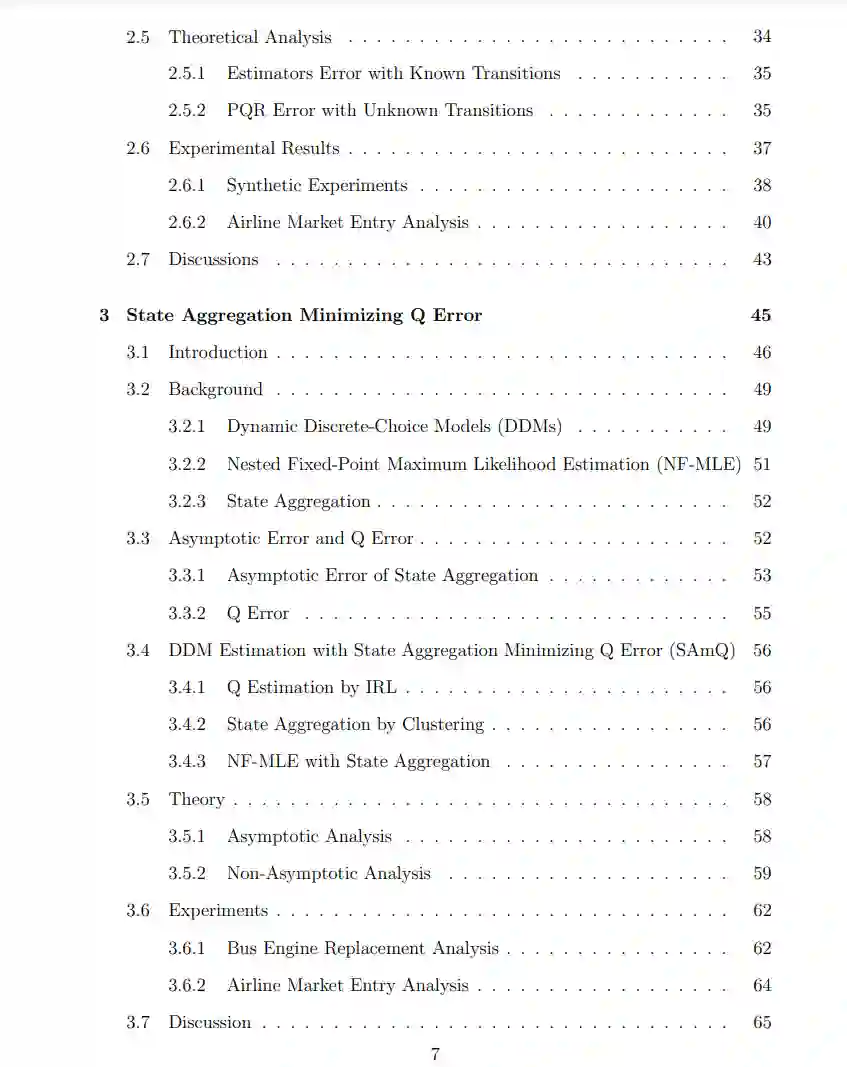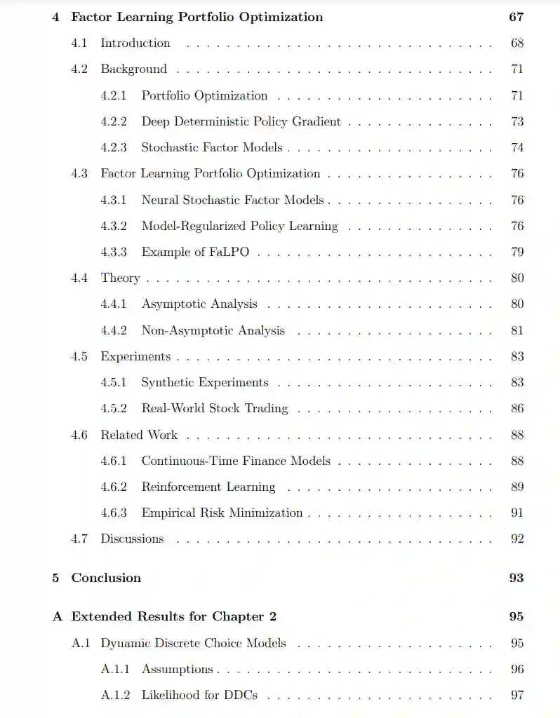 为了应对高质量数据的缺乏,我们的策略是利用经济学和金融学中的决策模型。在本论文中,我们重点研究的两个典型决策模型是动态离散选择模型 [Aguirregabiria 和 Mira, 2010] 和连续时间金融模型 [Merton, 1969]。这些模型在解释现有的决策制定和提供决策策略方面都有着悠久的成功历史。我们的目标是使用这些模型来规范ML方法,使其能够应对高质量决策数据的缺乏。