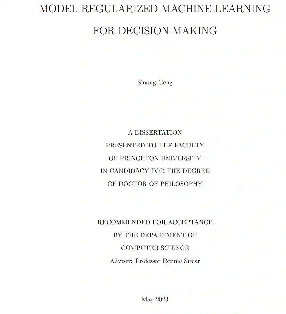 由于越来越多的高维数据的可用性,最近在机器学习(ML)方面的发展已经重新定义了许多领域的决策制定。然而,由于缺乏高质量数据所导致的ML在决策制定中的不可靠性的斗争尚未结束,并且在几乎每一个应用中都是一个重要的障碍。这引起了一些问题,如 (i) 为什么ML方法在新环境中无法复制决策行为? (ii) 为什么ML为现有的专家决策提供不合理的解释? (iii) 在嘈杂和高维的环境下,我们应该如何做出决策?许多这些问题可以归因于缺乏一个有效且样本高效的机器学习方法的基础模型。本论文介绍了我们的研究努力,致力于在逆向强化学习和强化学习的领域开发模型正则化的ML来解决上述问题,应用于客户/公司行为分析和投资组合优化。具体来说,通过应用来自合适模型的正则化,我们提出了针对两个不同目标的方法:(i) 更好地理解和复制人类专家和企业的现有决策;(ii) 在可能没有足够的大量高质量数据的情况下,进行更好的顺序决策,同时克服这一需求。