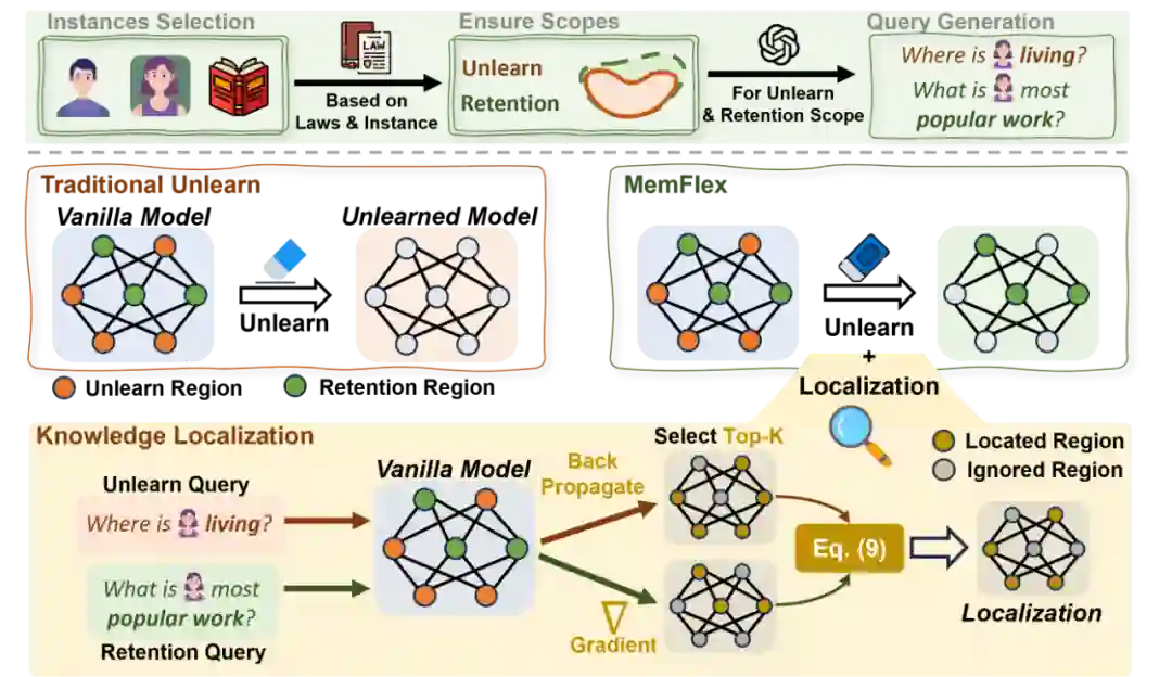 MemFlex方法受到知识编辑中的知识定位以及利用梯度信息提高定位精度相关研究的启发。其核心是通过分析梯度信息来确定模型参数空间中的擦除范围(Unlearn Scope)和保留范围(Retention Scope),然后在擦除阶段仅对擦除范围内的参数进行更新。以下是具体步骤: