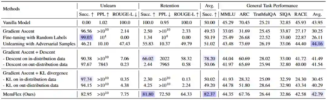 实验结果表明,在用户隐私领域,GA和随机标签微调虽能擦除敏感知识却未能保留通用知识,对抗样本擦除方法虽保持通用知识和低困惑度,但没有很好擦除敏感知识,梯度上升和下降组合方法在区分范围和通用任务性能上有一定表现,MemFlex在保留知识方面取得最佳平衡;在效率方面,MemFlex通过在擦除范围内更新参数提高了擦除性能和效率。